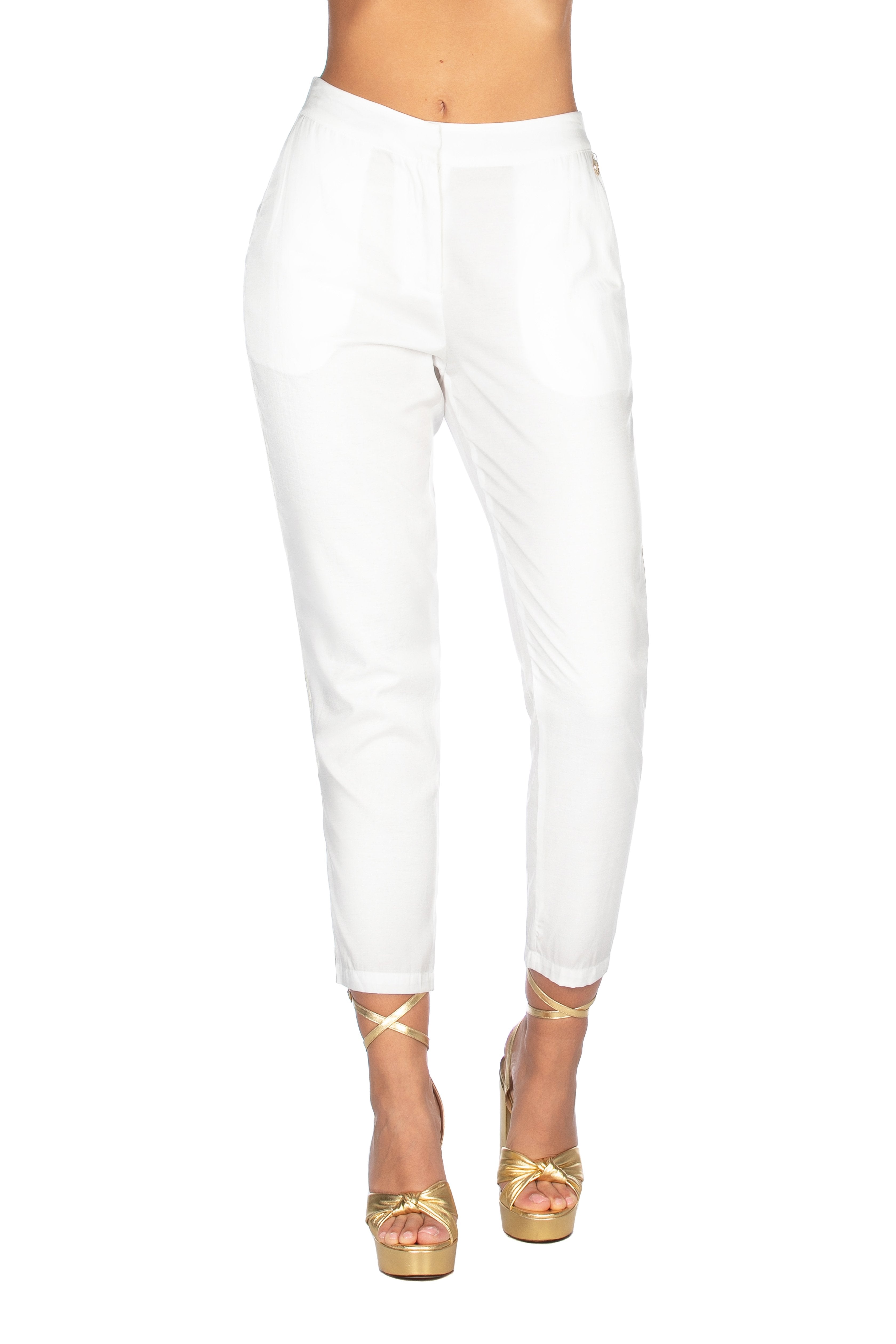 La donna pimpante e gioiosa indossa questo pantalone con grande disinvoltura per affrontare le sue intense giornate calde.