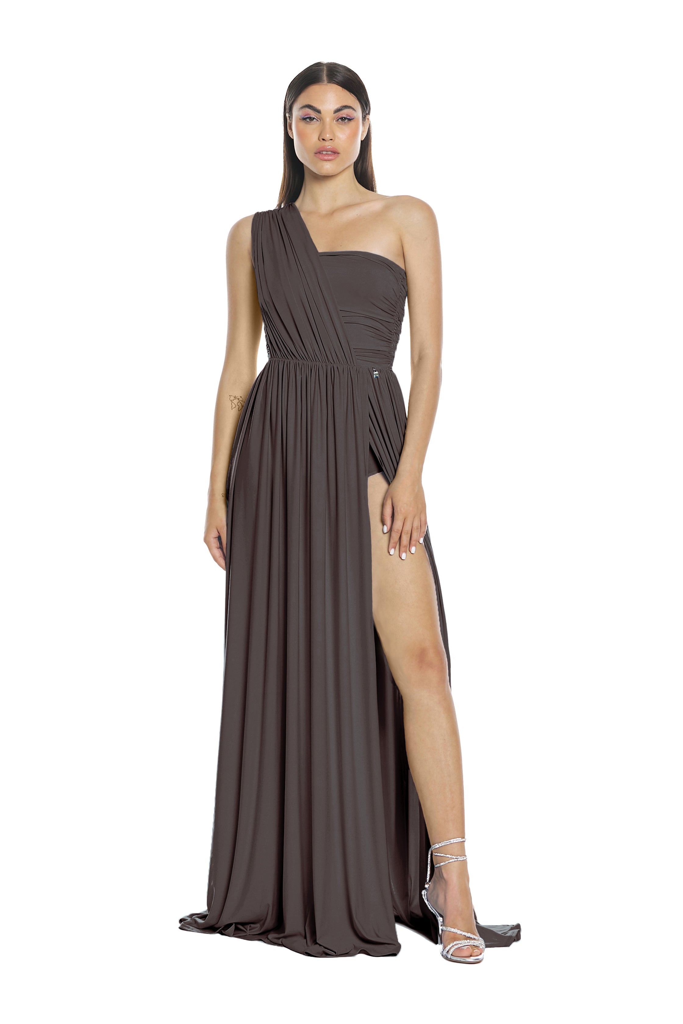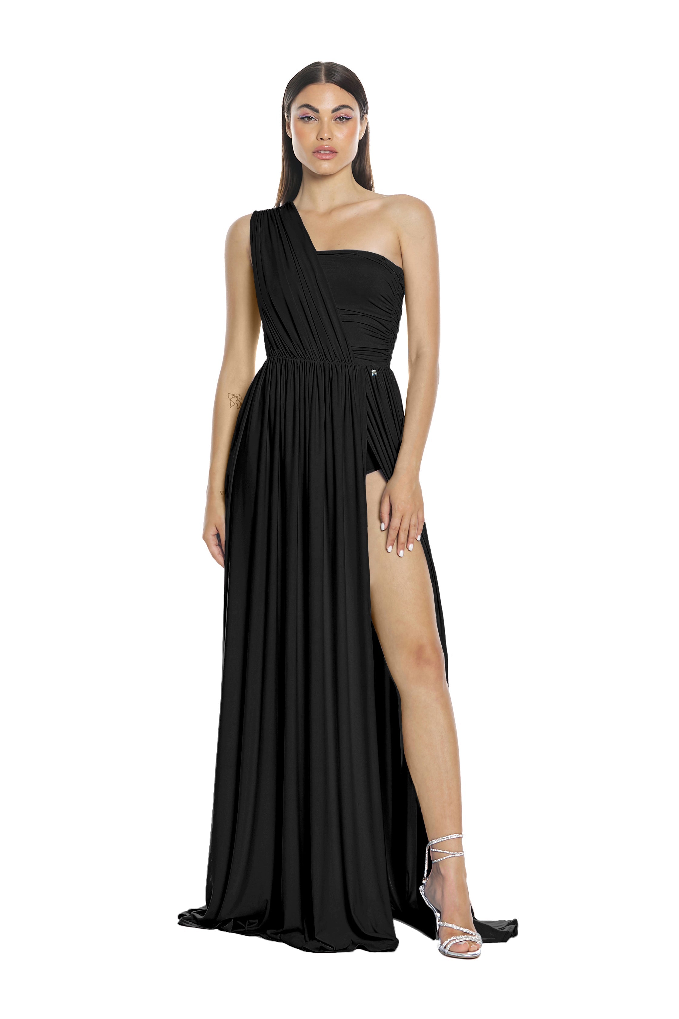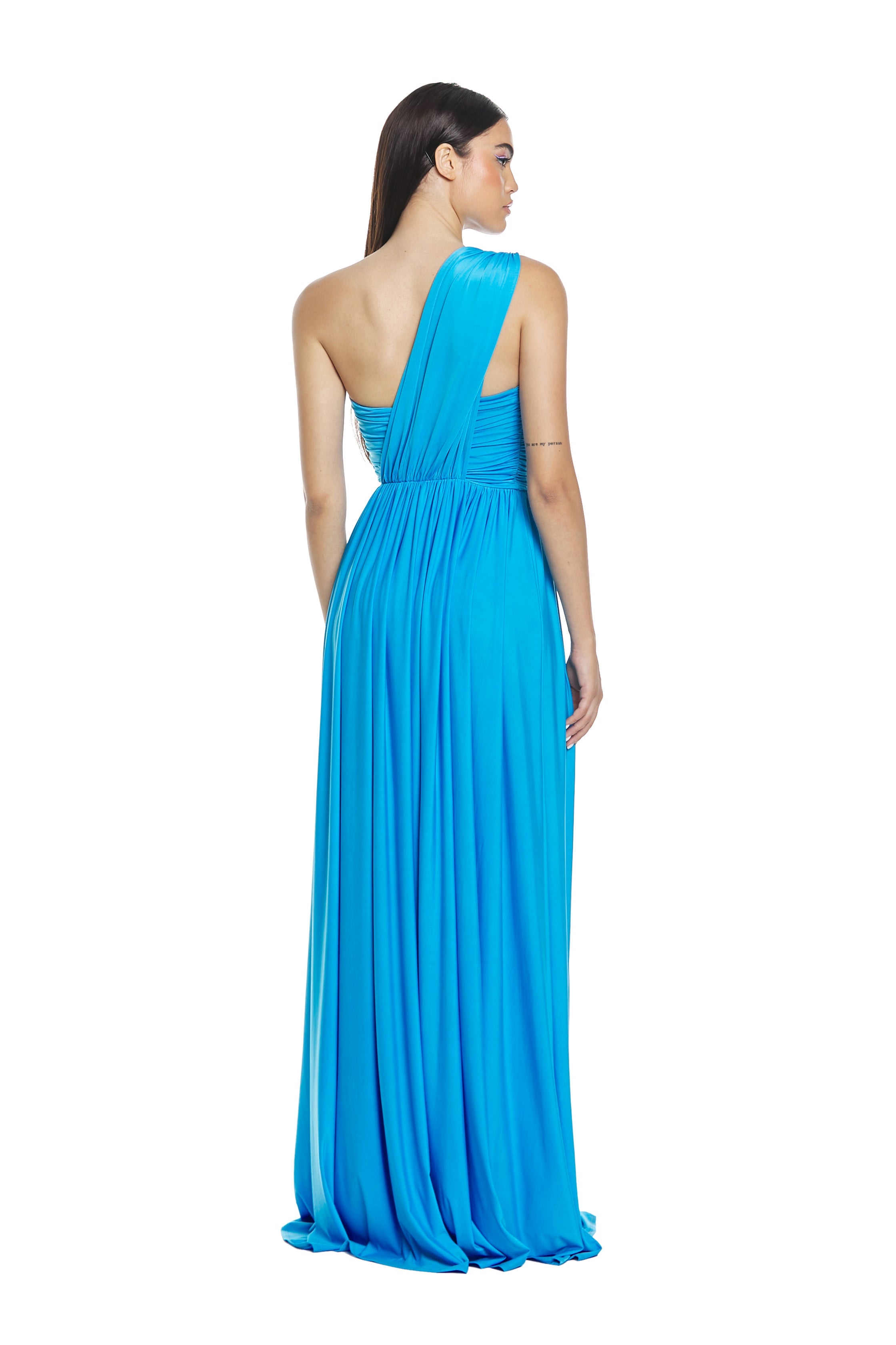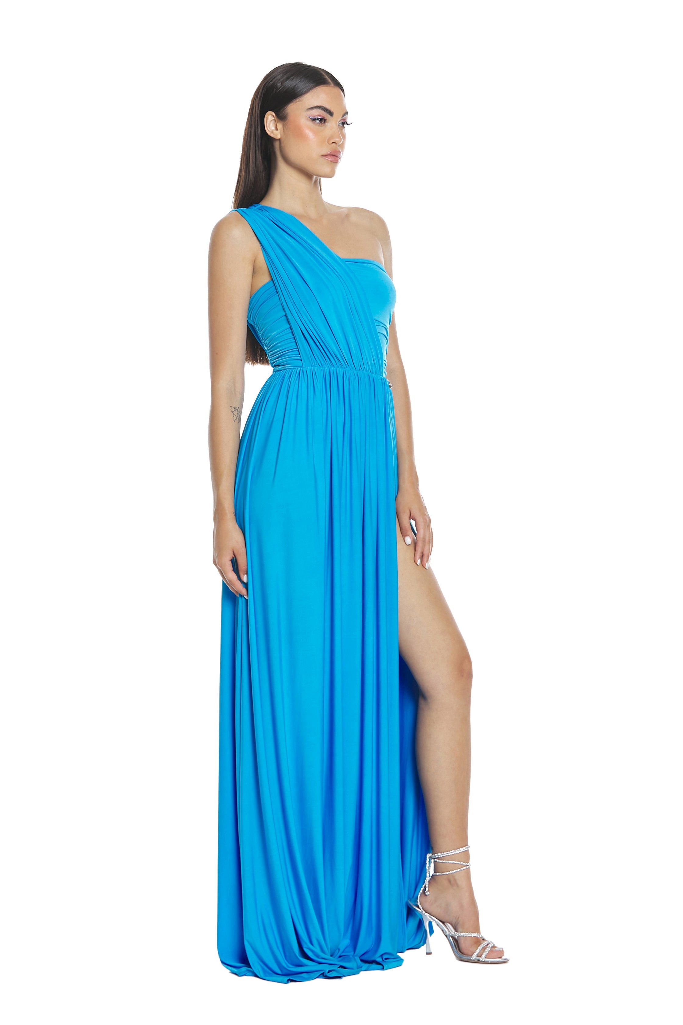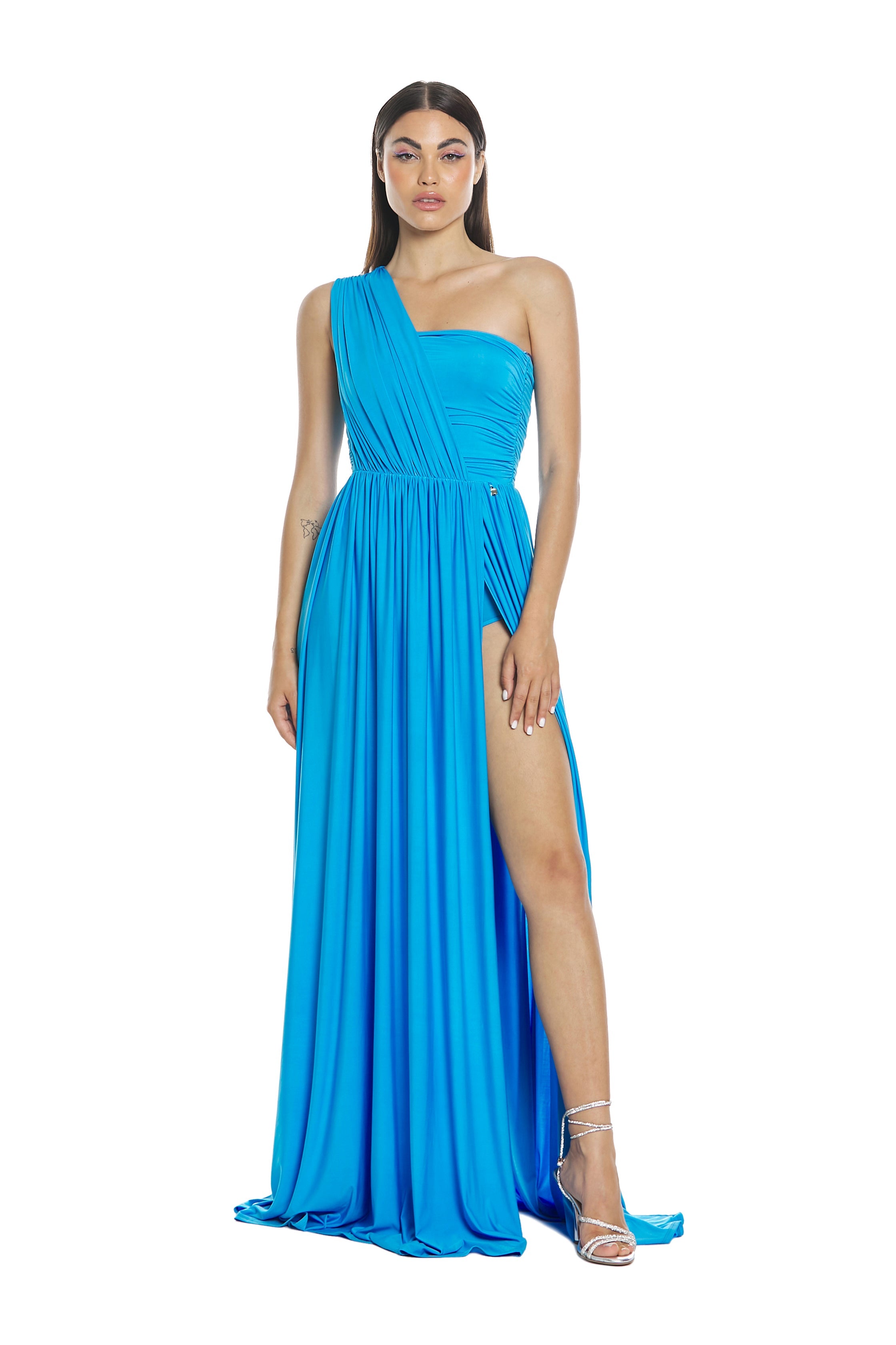 Ad ogni tuo passo ACUBENS si apre vaporoso e nello spacco laterale dona visione alle gambe che diventano protagoniste svelate con garbo tra arricci e plissè.