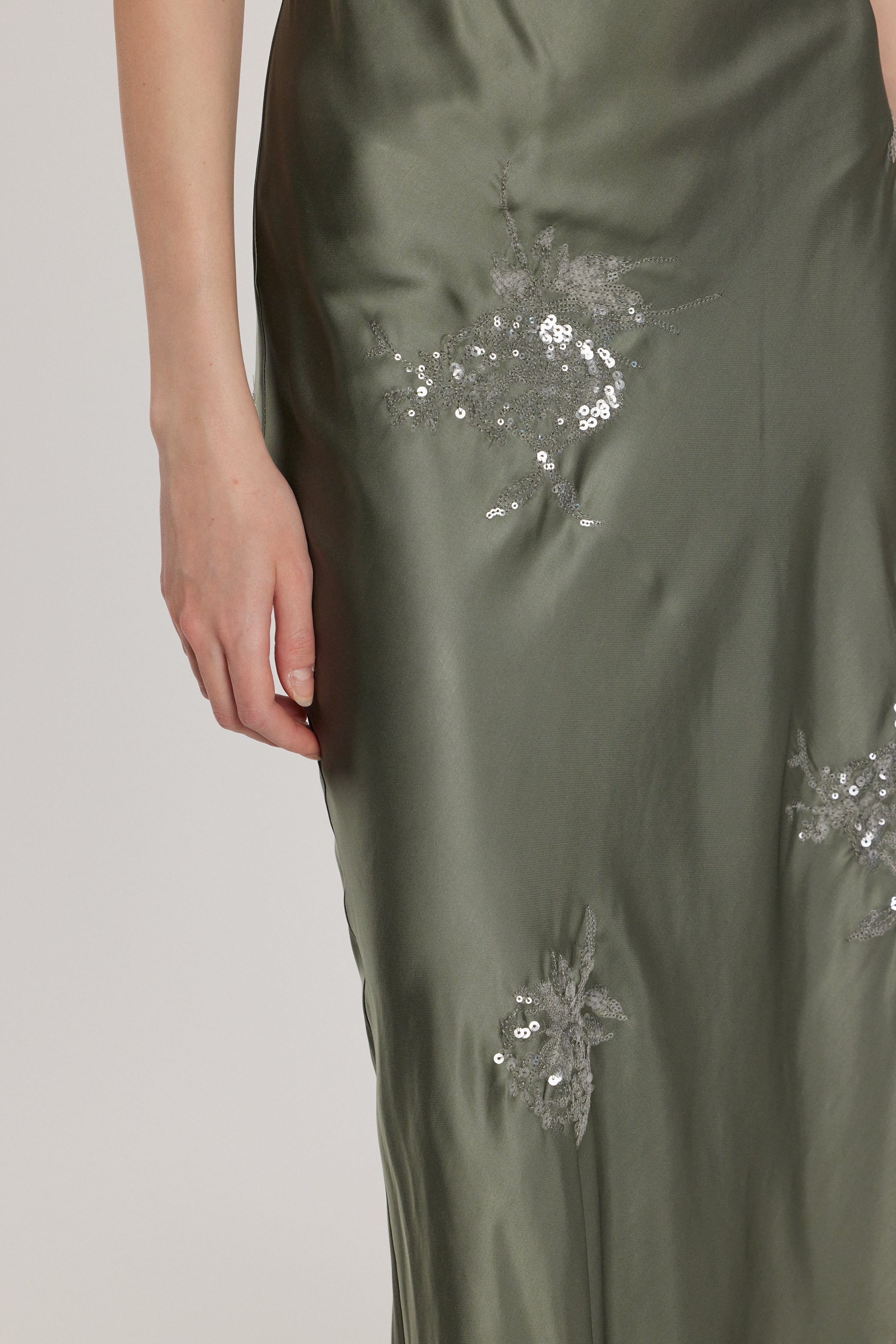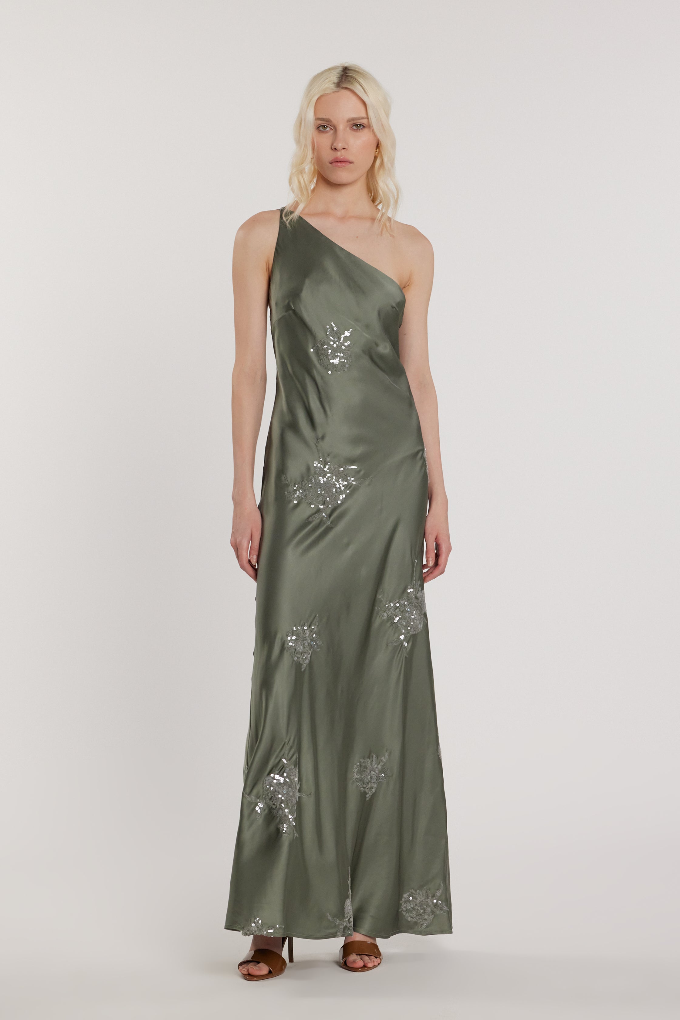 Abito ARCAJA lungo monospalla più stringhe dietro con ricamo fiori paillettes