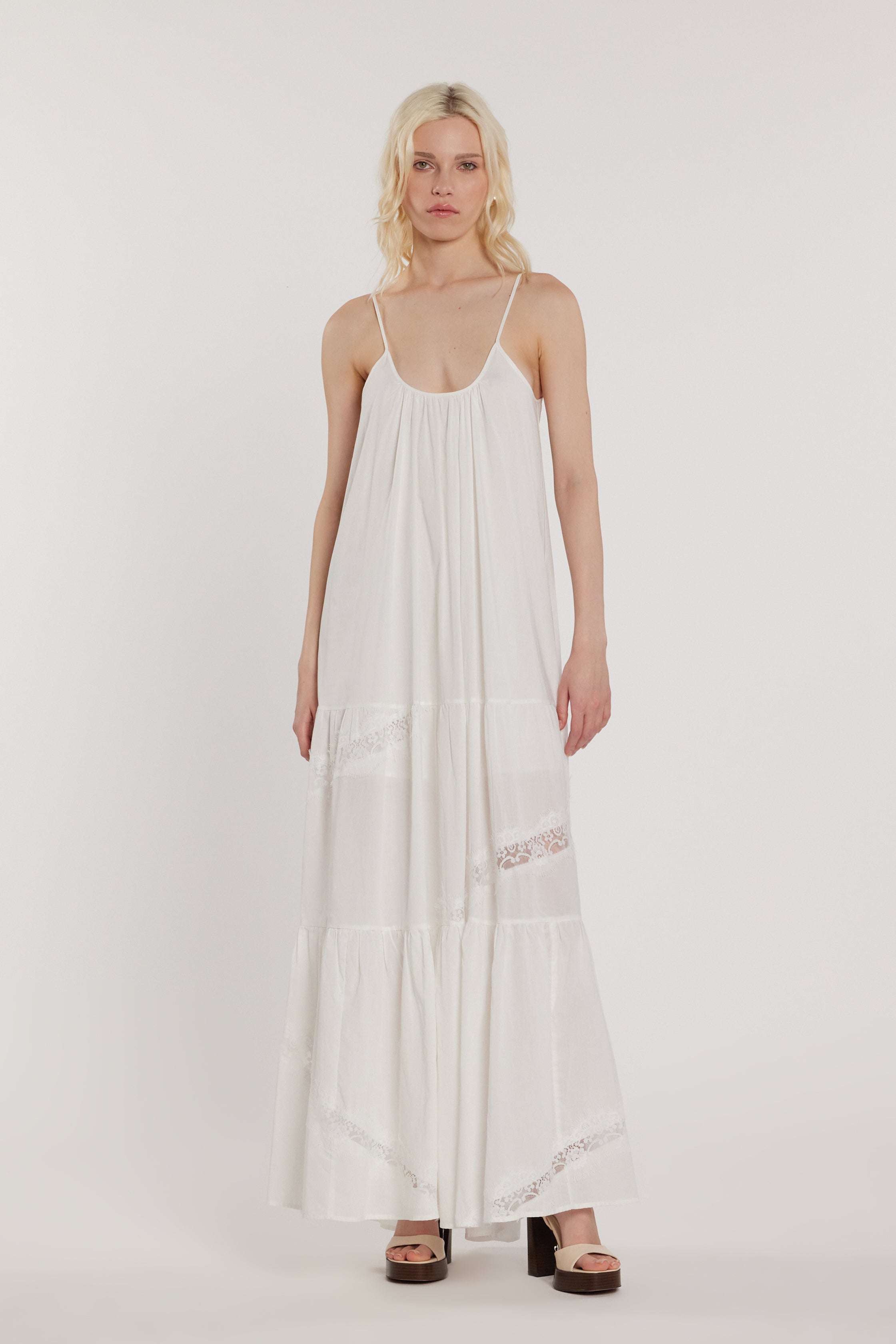Abito CATHERY lungo smanicato con arricci più balze più inserti pizzo