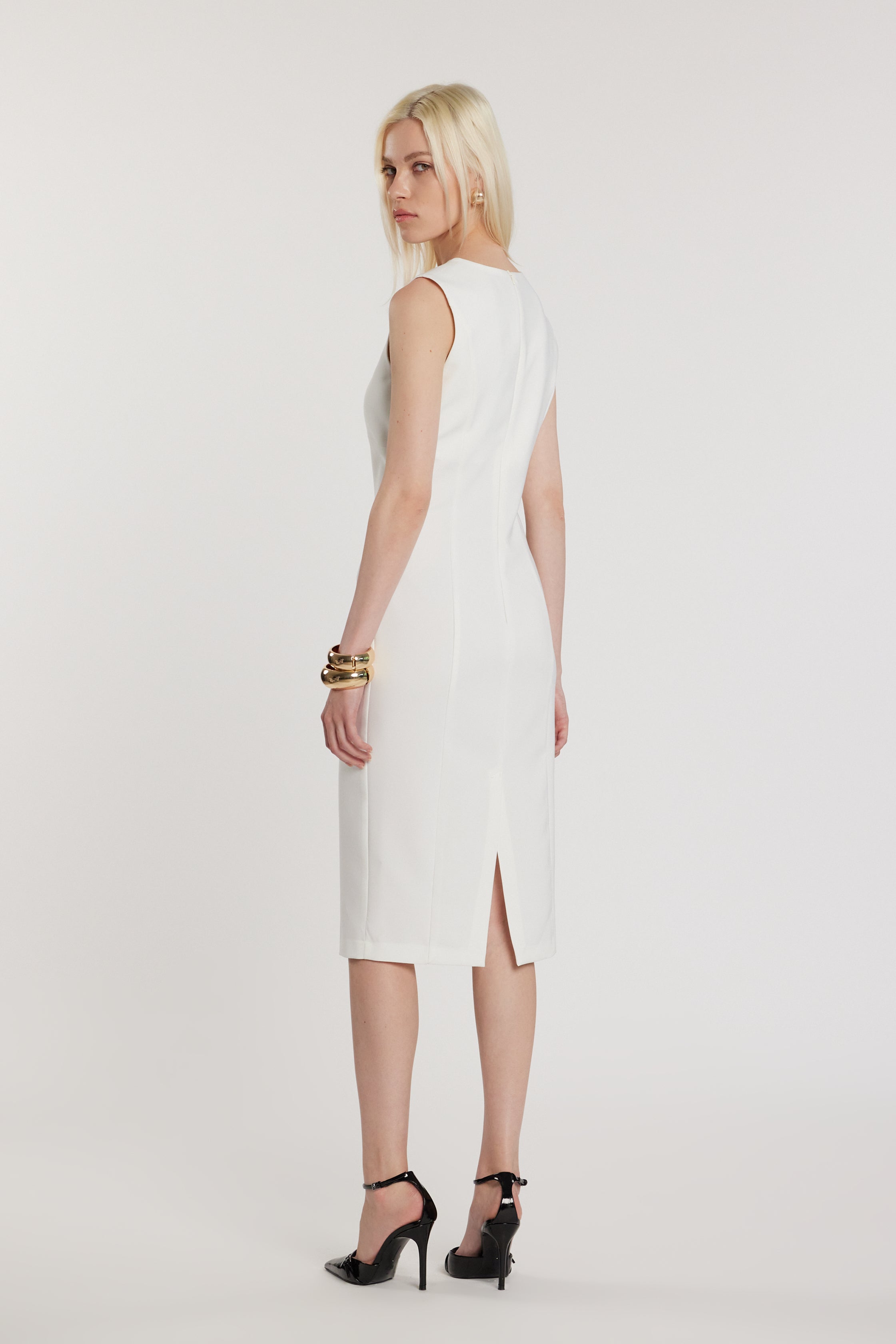Abito Cecile midi senza maniche con apertura, passante e spacco, un modello elegante e raffinato. Lo spacco aggiunge movimento e sensualità discreta, mentre il passante valorizza il punto vita, ideale per look da sera sofisticati.