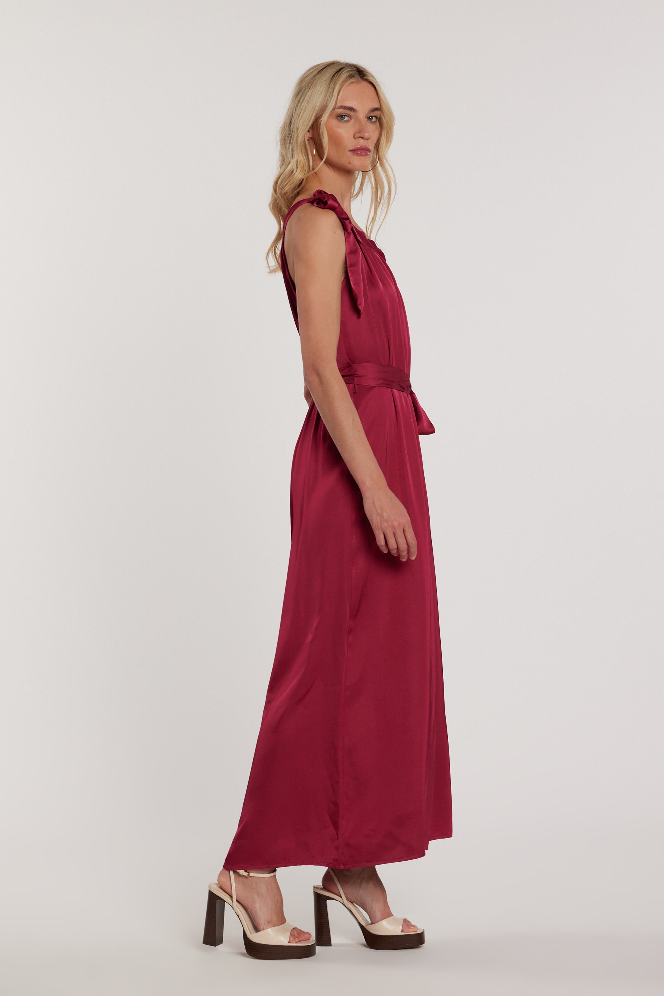 Abito Fiokko lungo senza maniche con scollo alla americana e fusciacca al collo, un modello sofisticato e romantico. La fusciacca valorizza il collo con femminilità, mentre la linea lunga e fluida dona movimento e leggerezza, perfetto per eventi serali.
