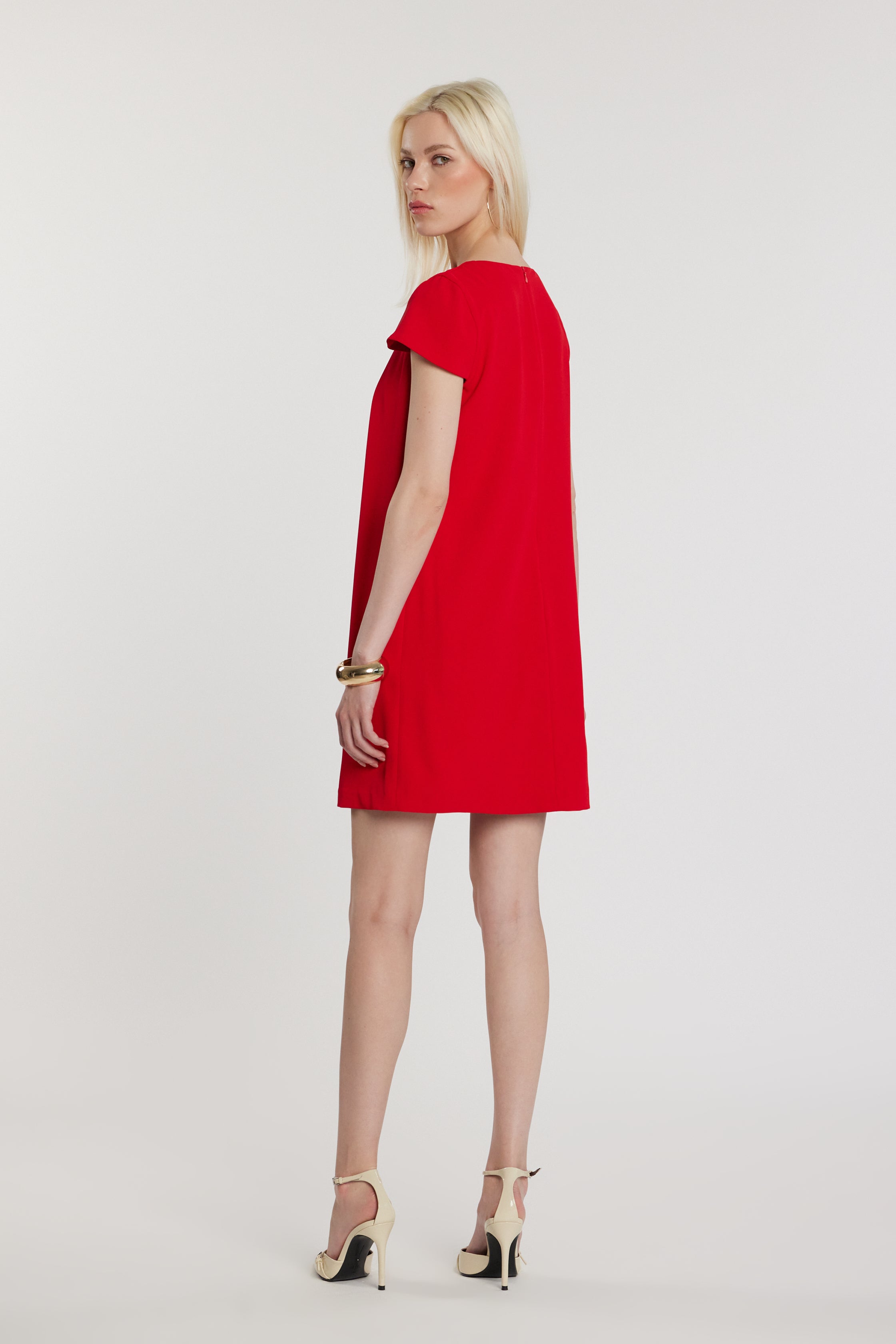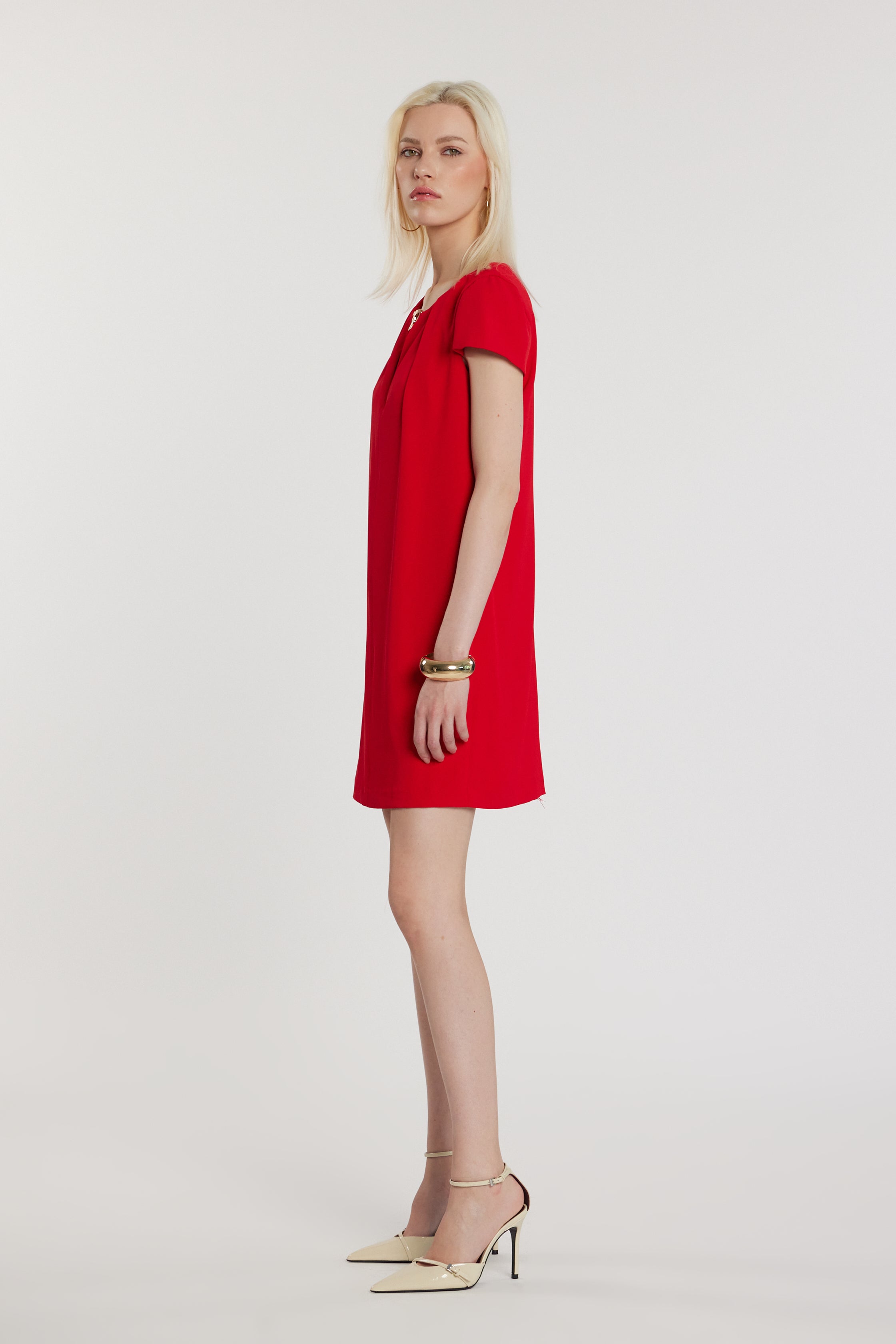 Abito Stephane corto maniche corte con scollo a V, passante logo e pieghe delicate, un capo giovane e raffinato. Le pieghe aggiungono movimento, lo scollo valorizza il décolleté e il passante logo dona carattere contemporaneo, ideale per look da giorno glamour.
