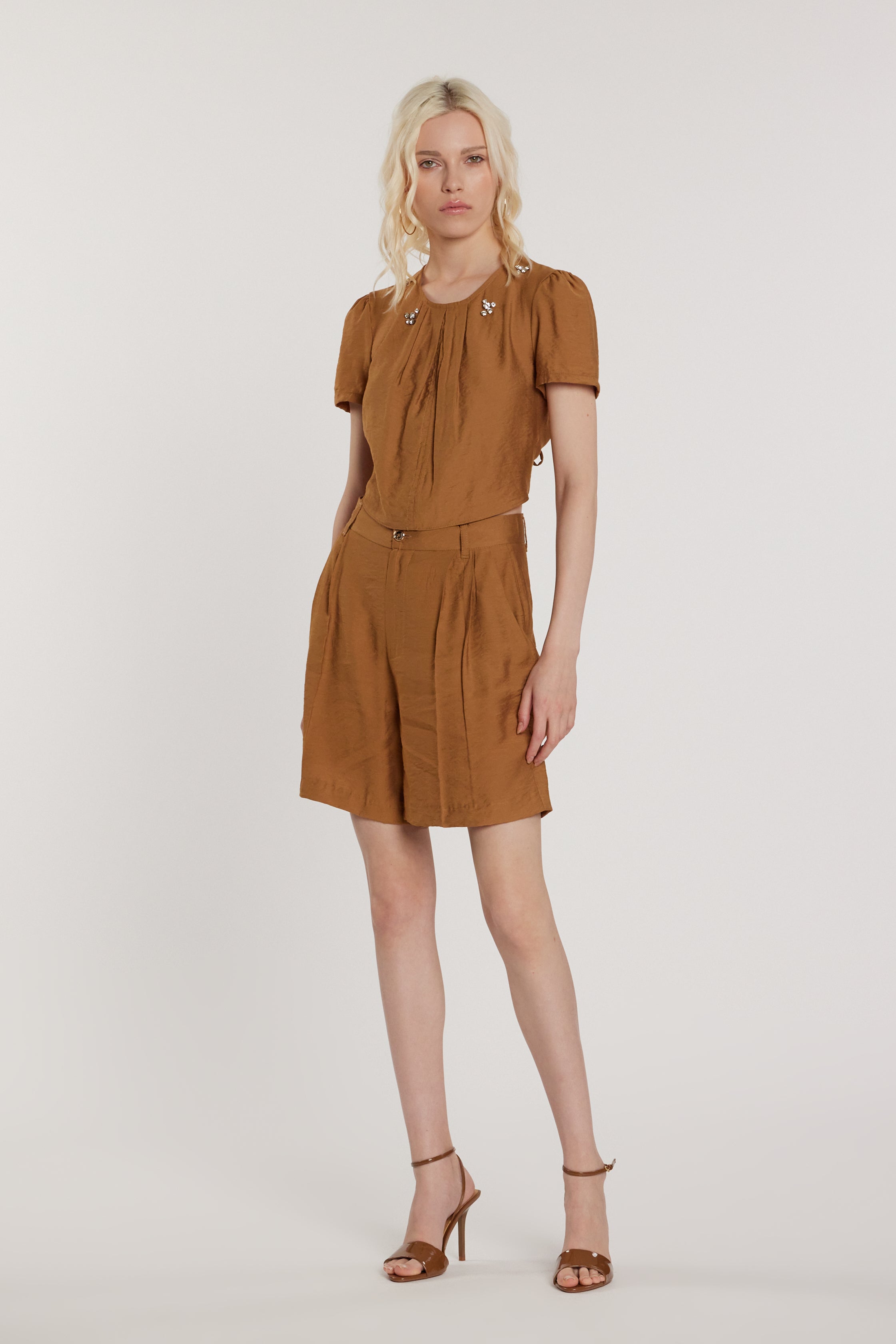 Blusa Demarty corta senza maniche con applicazioni gioiello, pieghe, oblò sulla schiena e coulisse, un capo scenografico e raffinato. Gli oblò e le applicazioni aggiungono movimento e luce, mentre le pieghe valorizzano la figura con eleganza couture.