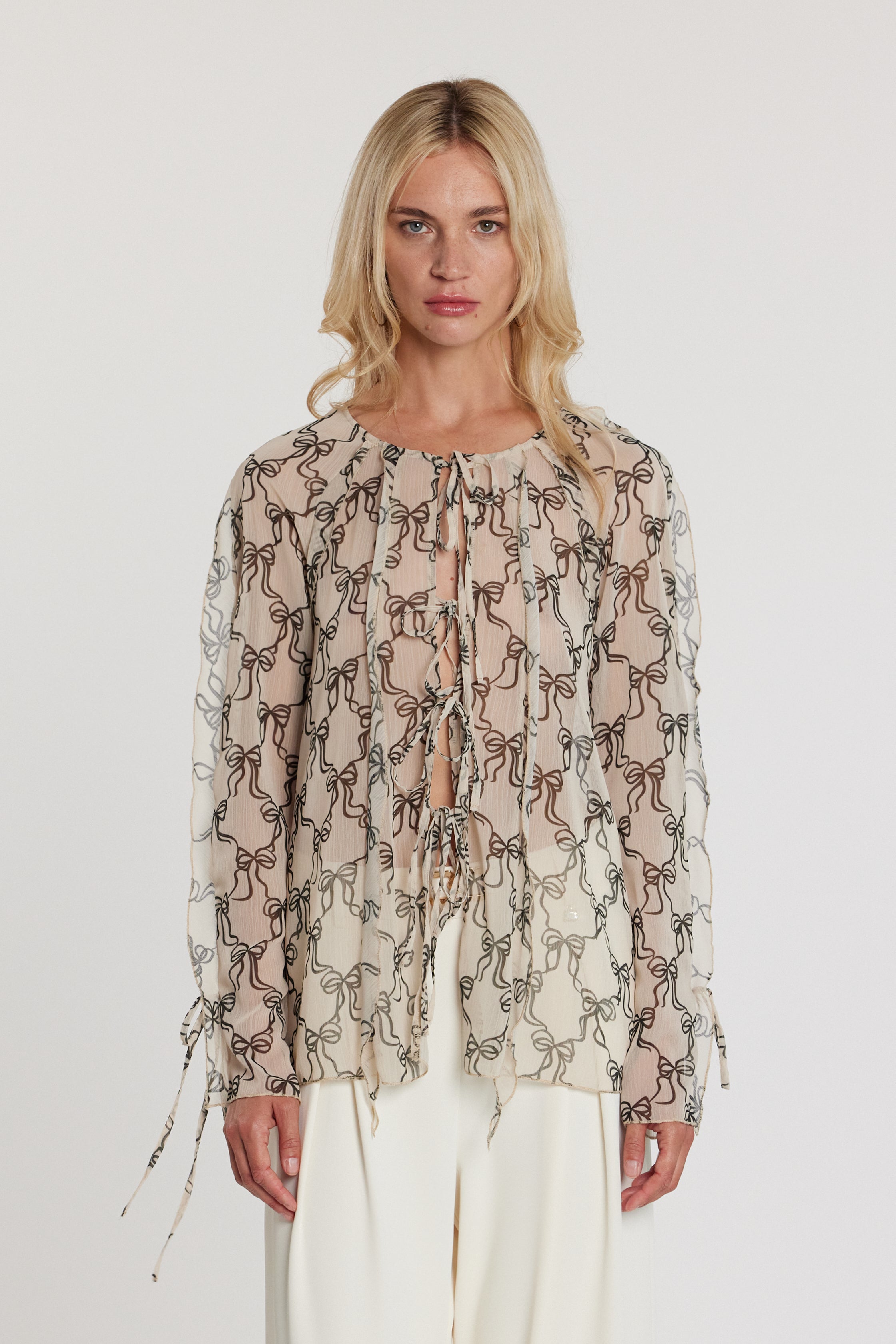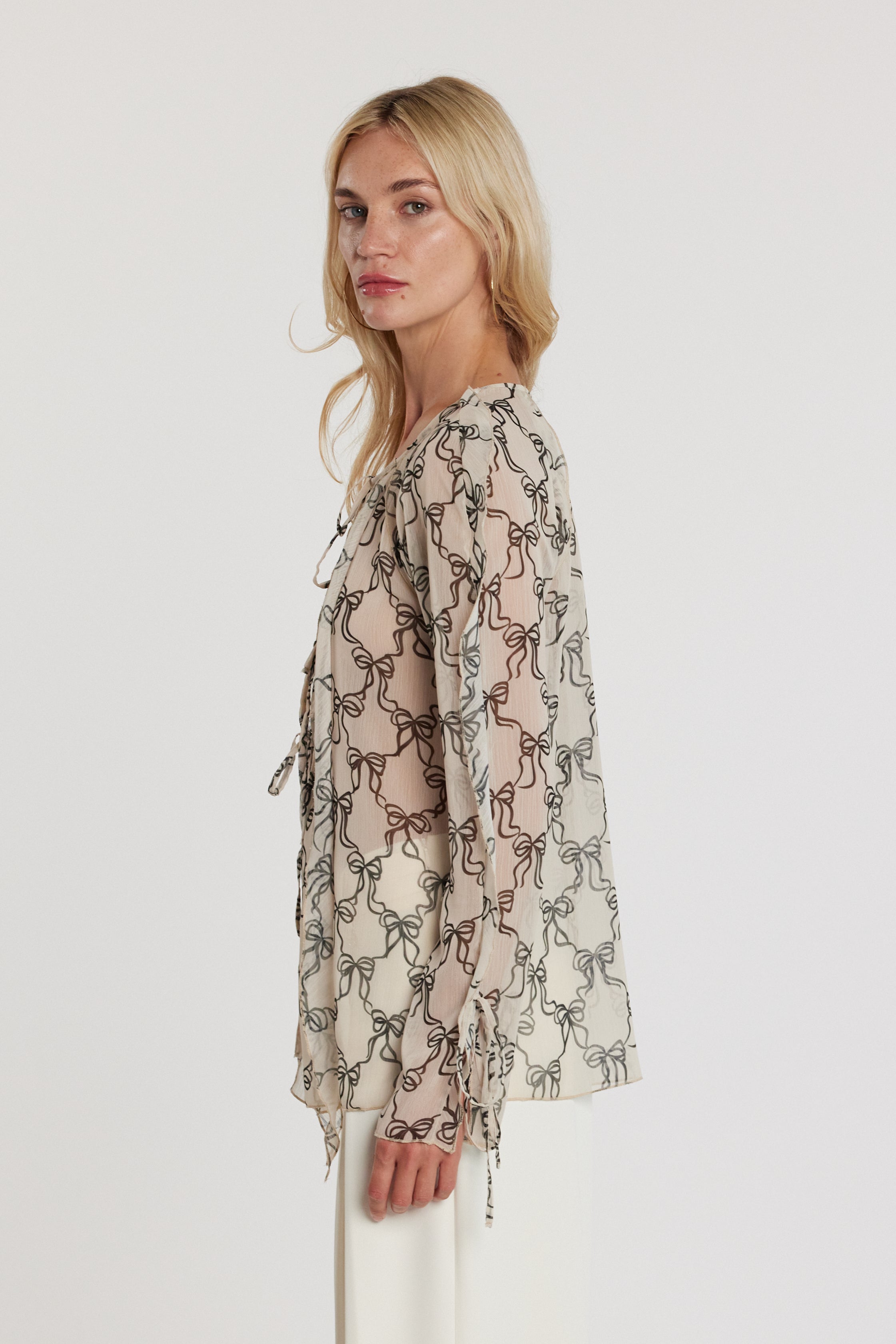 Blusa Diamy_Fio maniche lunghe con rouches, laccetti e fantasia a fiocchi, un capo romantico e sofisticato. Le rouches e i laccetti aggiungono movimento delicato, mentre la fantasia conferisce un allure femminile e couture. Perfetta per look eleganti da giorno o serali.