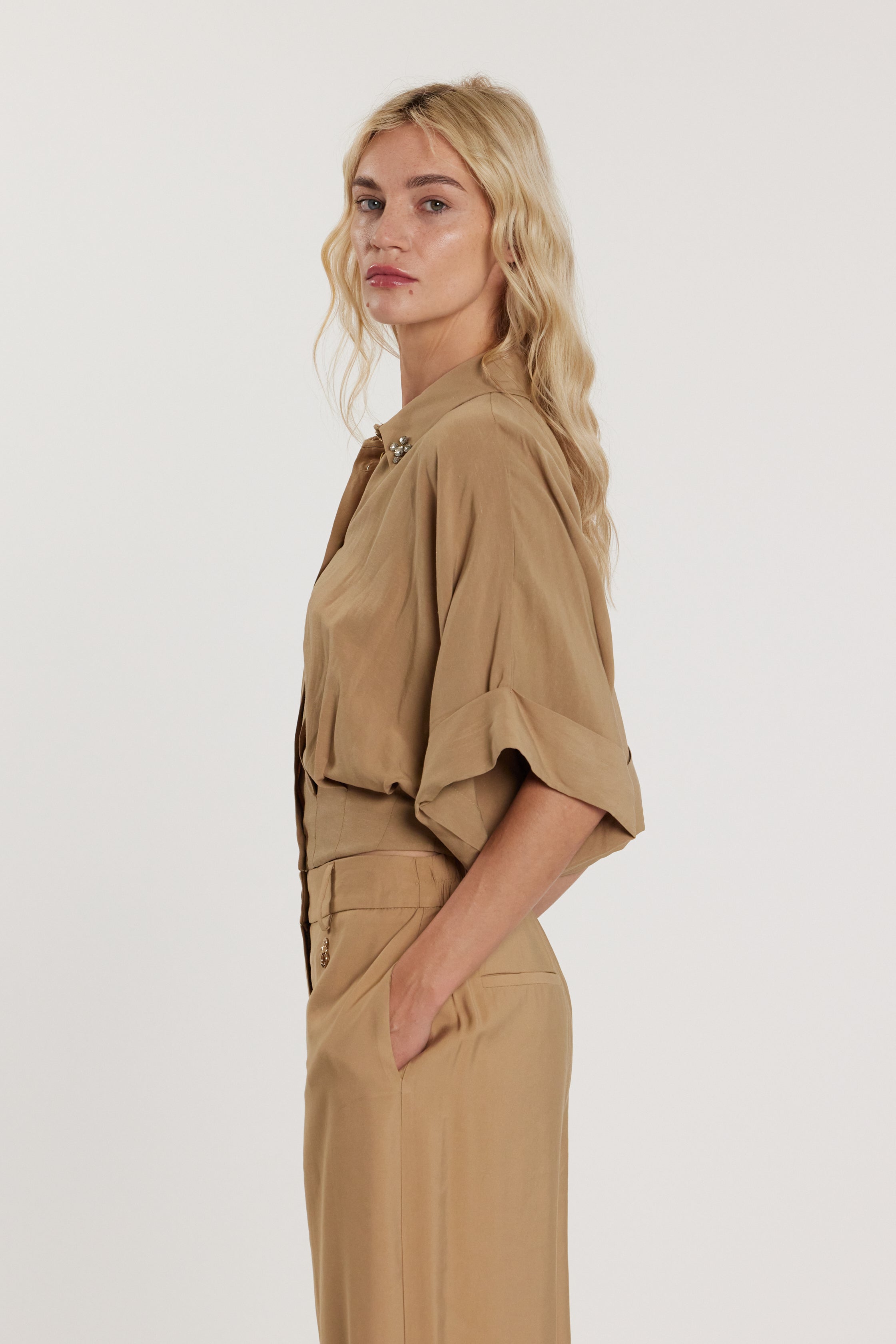 Camicia Trady maniche tre quarti in stile kimono con risvolto e applicazioni gioiello più pieghe sul fondo, un capo elegante e sofisticato. Le applicazioni e le pieghe donano luminosità e movimento couture, mentre il taglio kimono valorizza la silhouette con charme discreto.