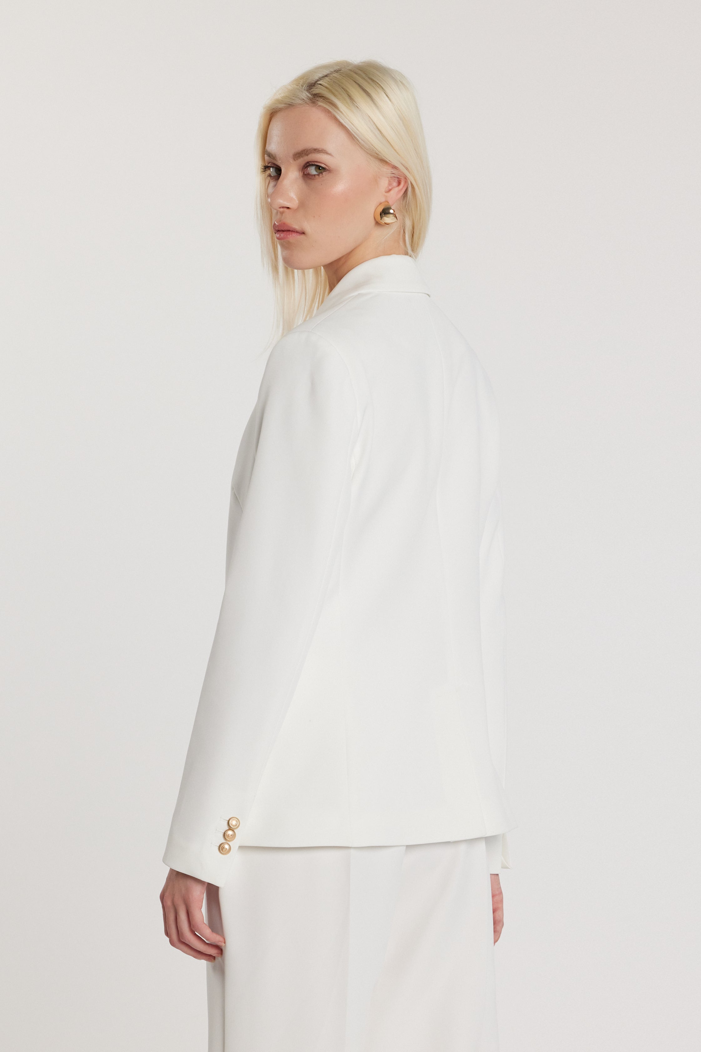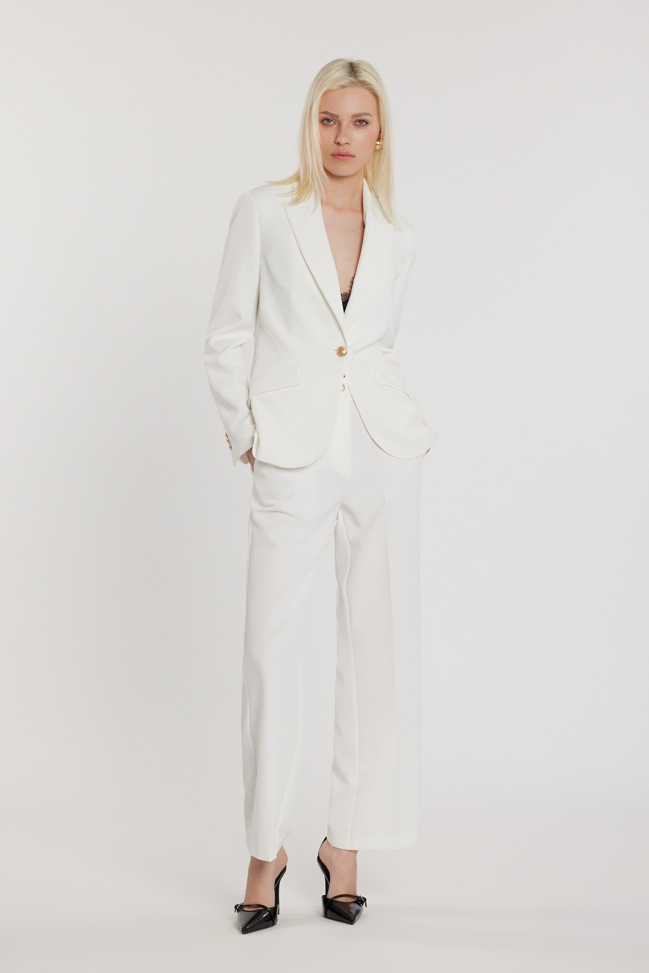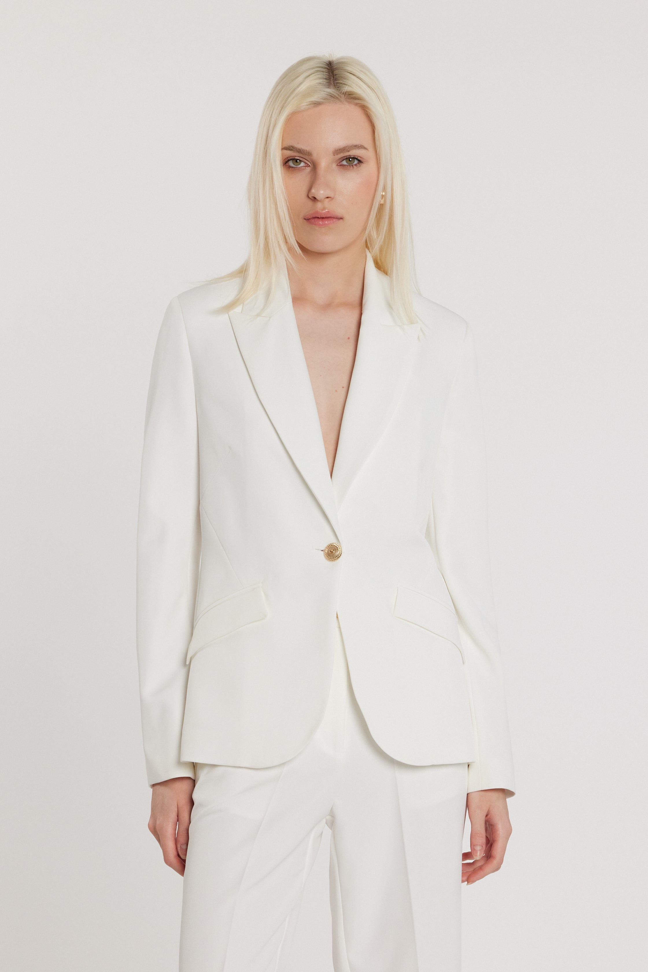 Giacca Skil maniche lunghe con chiusura a un bottone e patte oblique, un capo moderno ed essenziale che unisce rigore sartoriale e femminilità. Le patte oblique creano dinamismo visivo, mentre il taglio pulito valorizza la silhouette, rendendola ideale per outfit contemporanei e sofisticati.