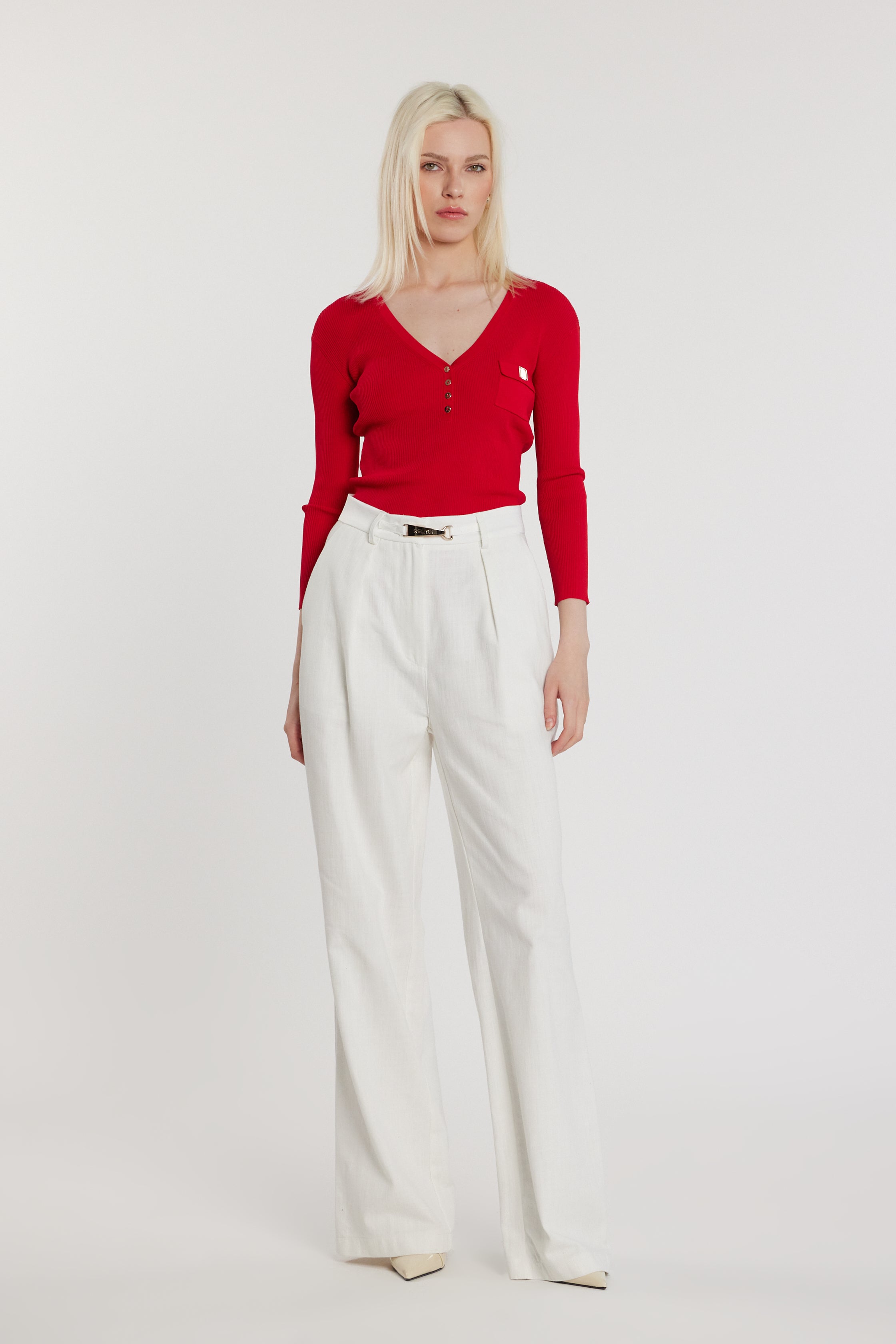 Maglia Deneuve maniche tre quarti con scollo a V, bottoncini e taschino in costina, un modello elegante e femminile. Il dettaglio del taschino e dei bottoncini valorizza il capo, mentre la linea morbida crea movimento armonioso.