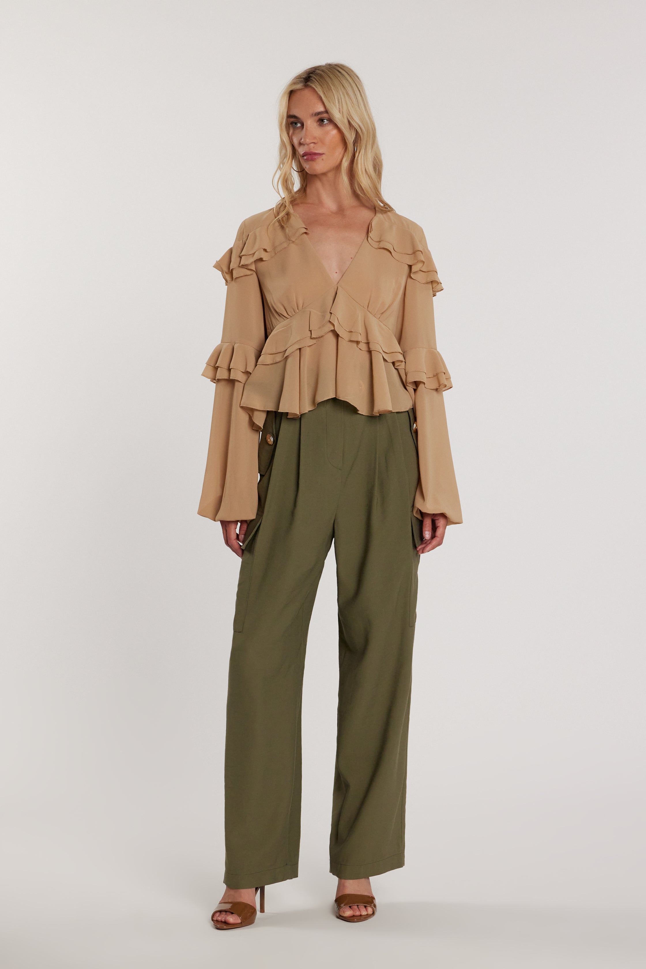 Pantalone Tection vita alta con patte, tasconi e cintura, un capo moderno e femminile. I tasconi aggiungono funzionalità, la cintura valorizza la vita e il taglio strutturato conferisce un’allure contemporanea e raffinata, ideale per look da lavoro o casual chic.