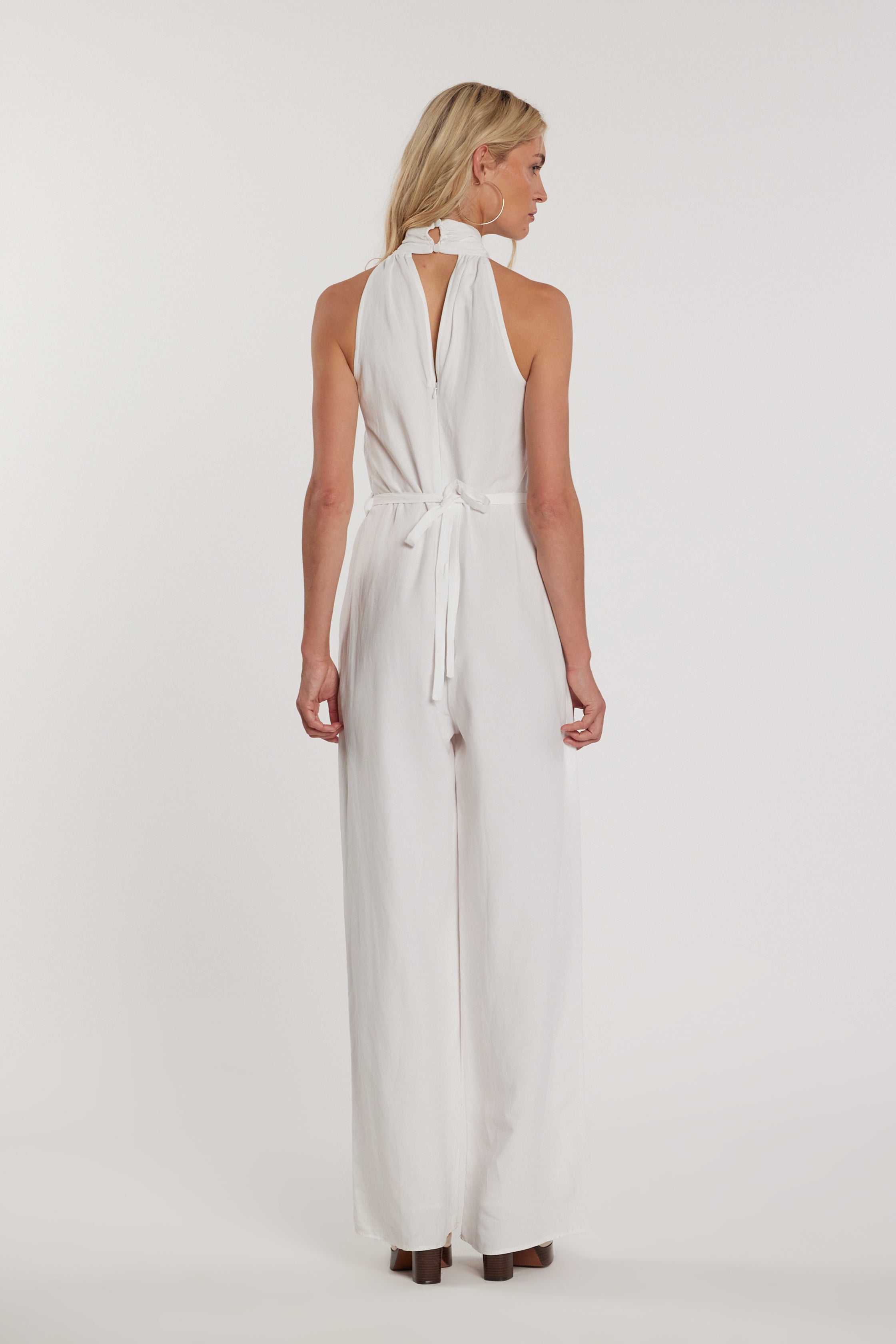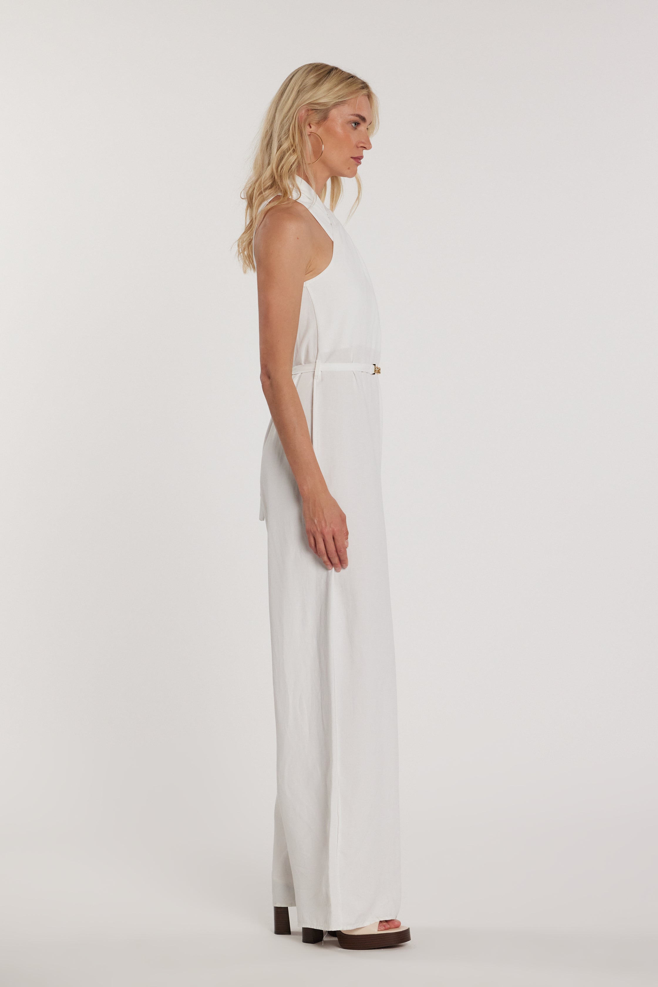 Tuta Timi lunga senza maniche con scollo incrociato, cintura e passanti, un capo scenografico e raffinato. Il taglio incrociato valorizza il décolleté, mentre la cintura definisce il punto vita, rendendola perfetta per look eleganti e serate glamour.
