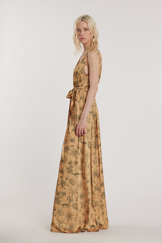 Abito JOHANSSON lungo smanicato doppio scollo profondo con incrocio più cintura fantasia tropical