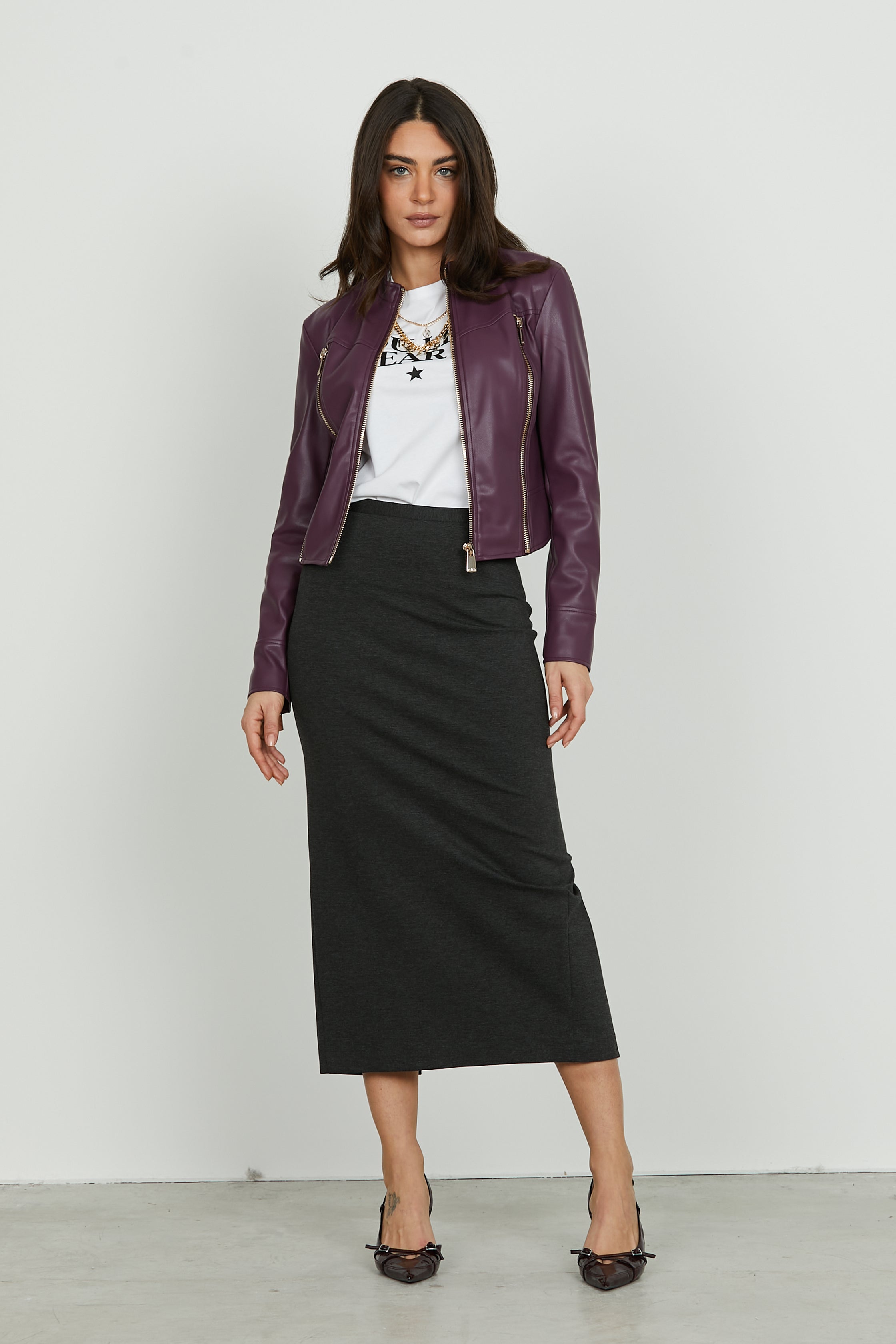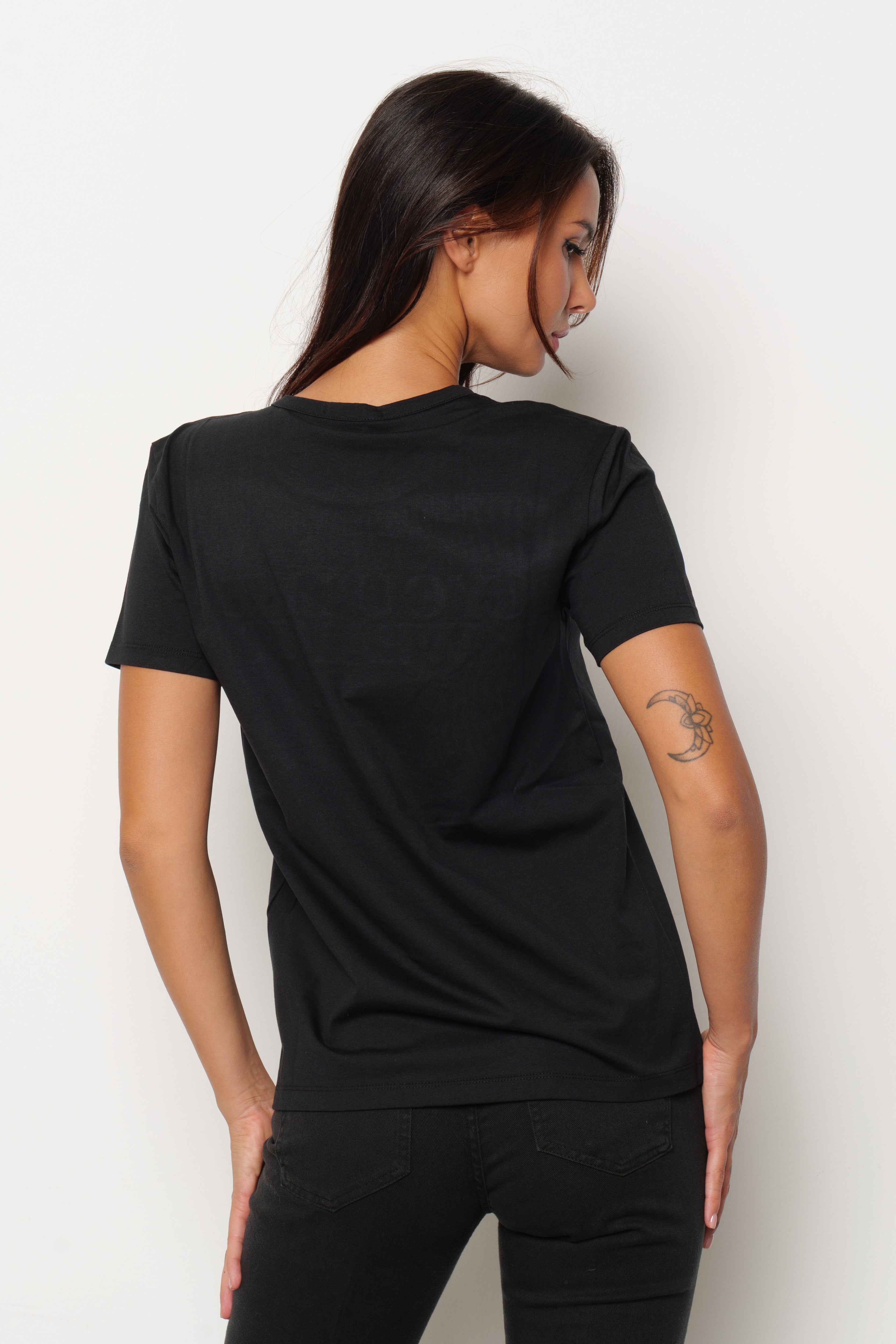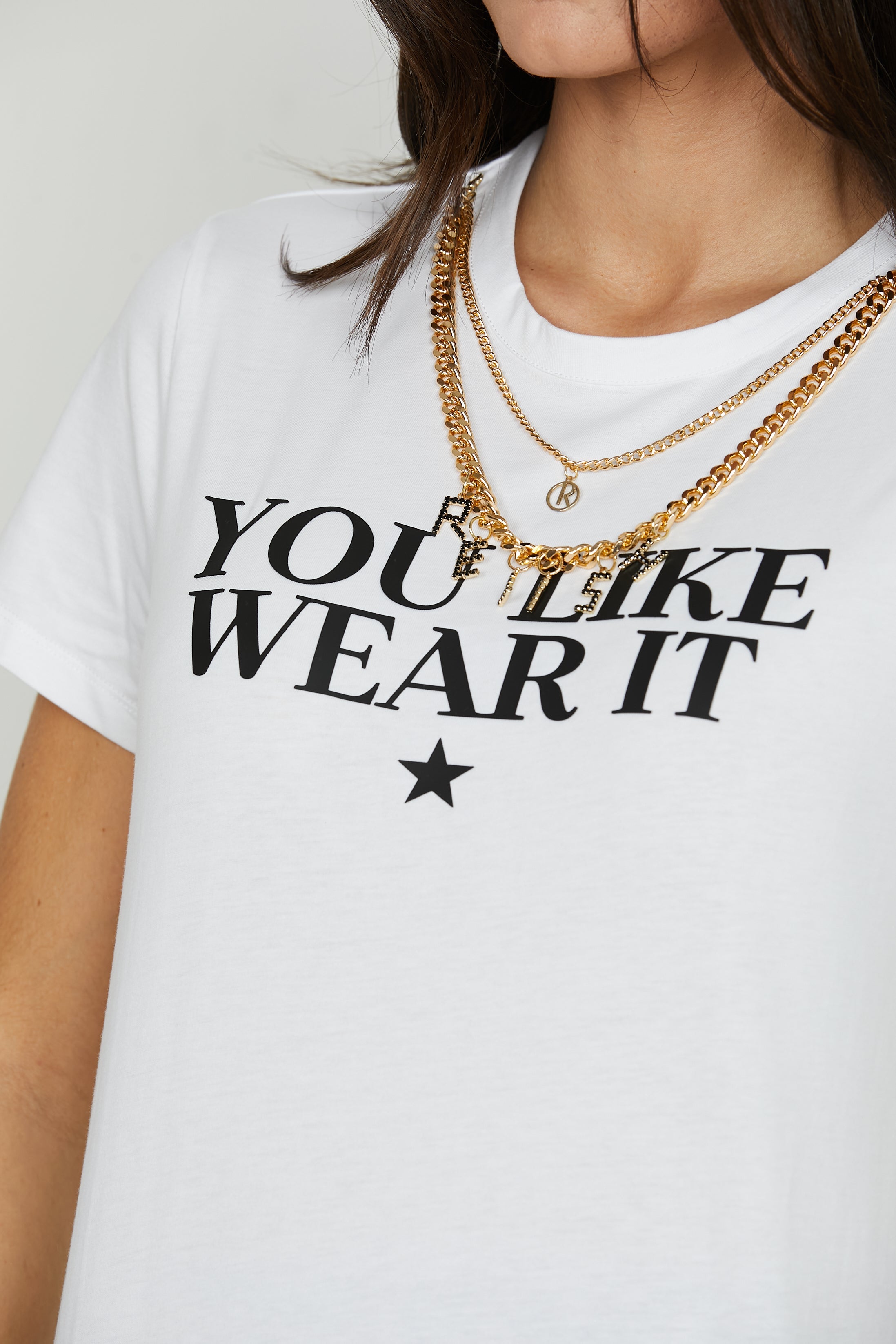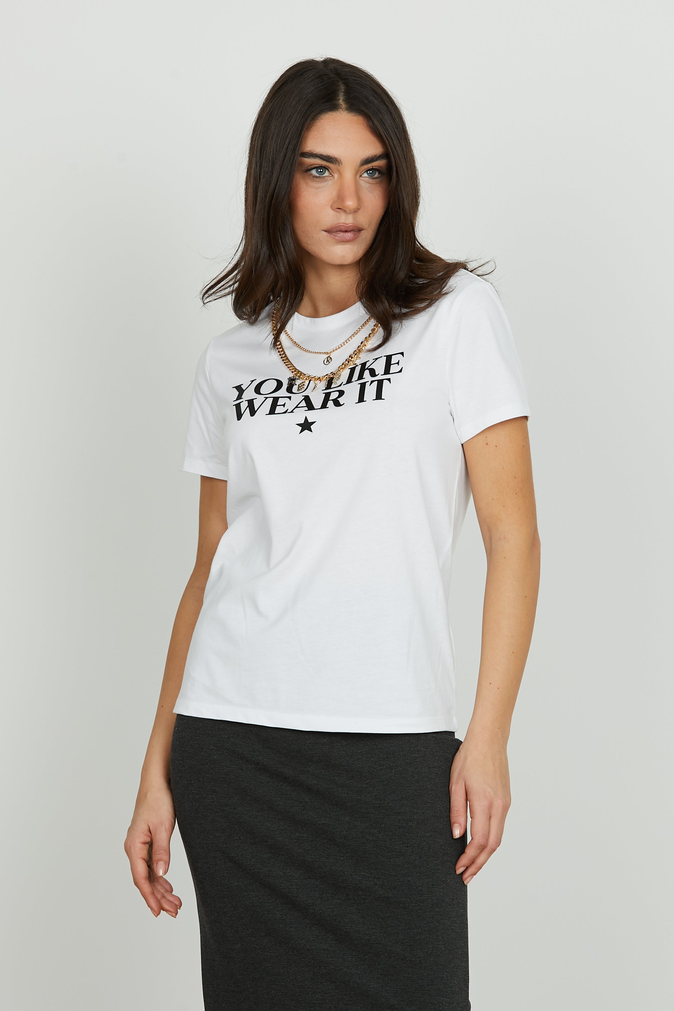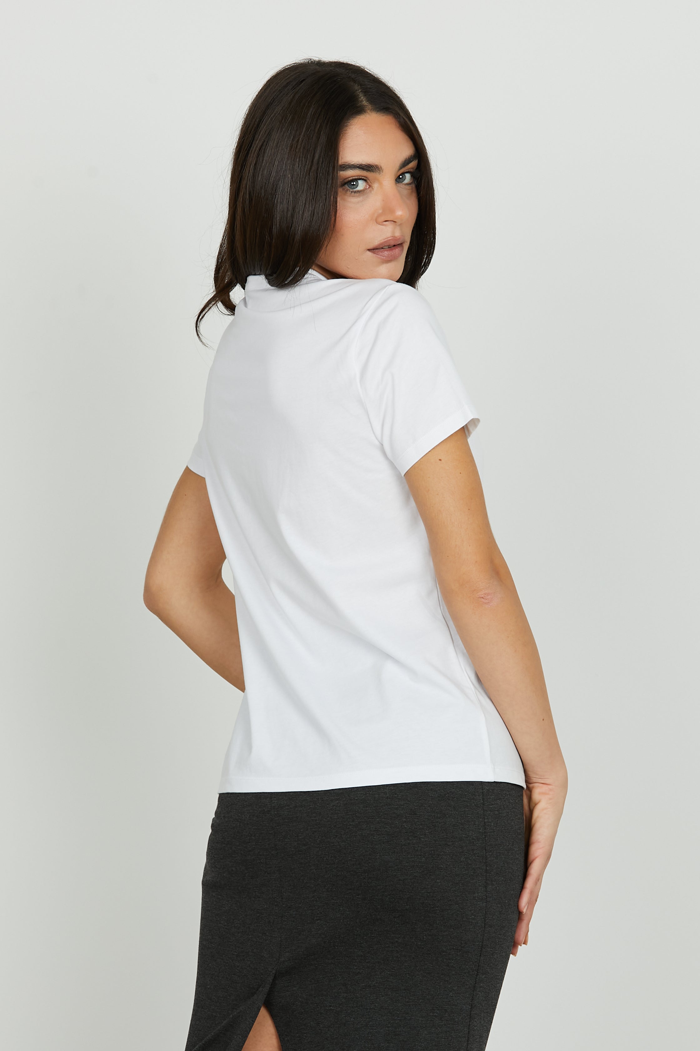 La classica T-shirt trova nuova vita con OLIM: un capo essenziale dallo spirito contemporaneo. Il dettaglio della catena applicata sul davanti dona carattere e un tocco fashion con il logo in evidenza che completa il look con stile deciso. Perfetta da indossare da sola o sotto giacche e blazer per un effetto casual-chic.