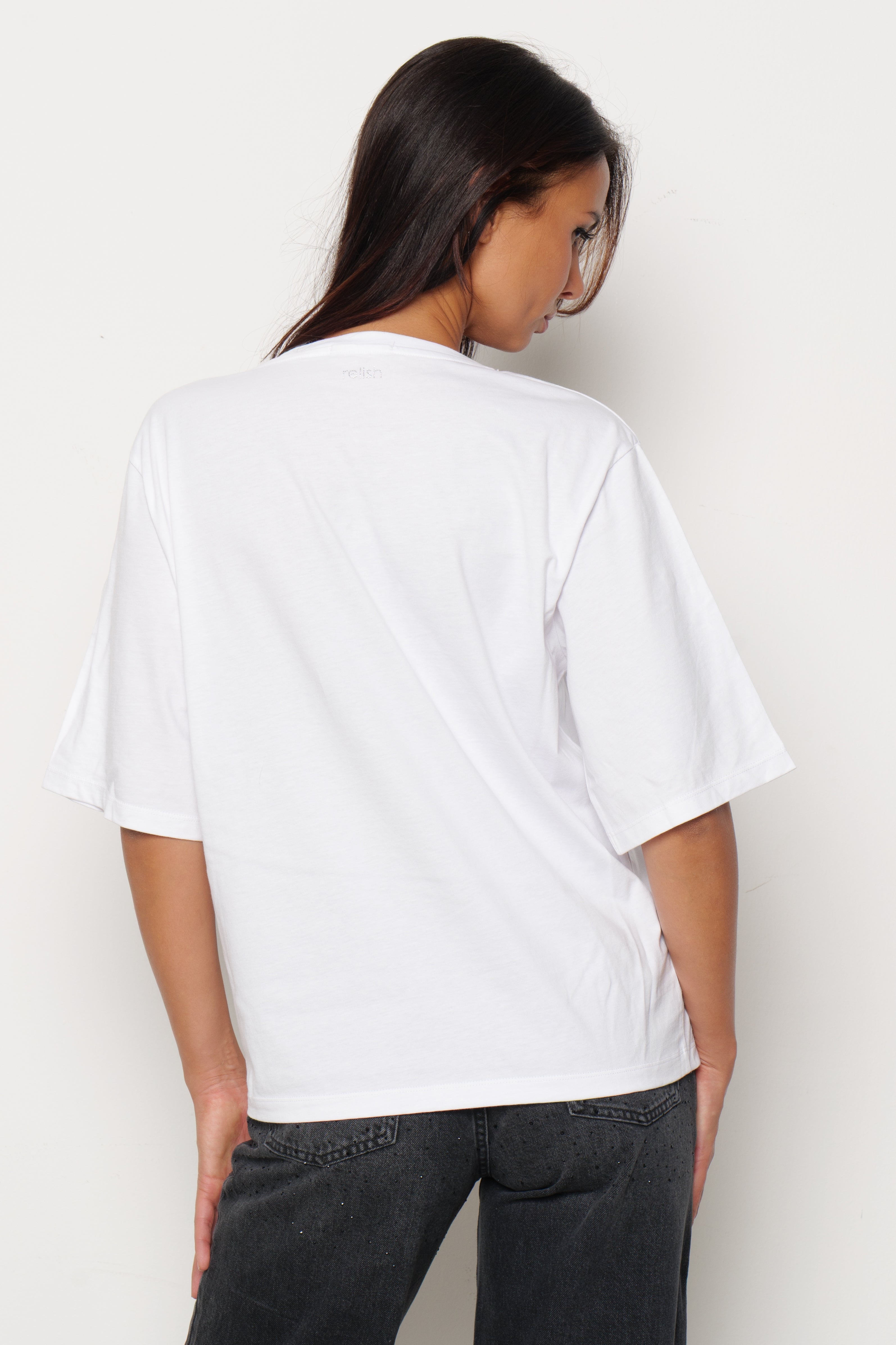 Un design pulito esaltato da dettagli luminosi: la T-shirt ROMOALD è impreziosita da pietre strass che aggiungono un tocco di luce discreta ma d’effetto. Perfetta per elevare anche i look più casual con un accento glam.