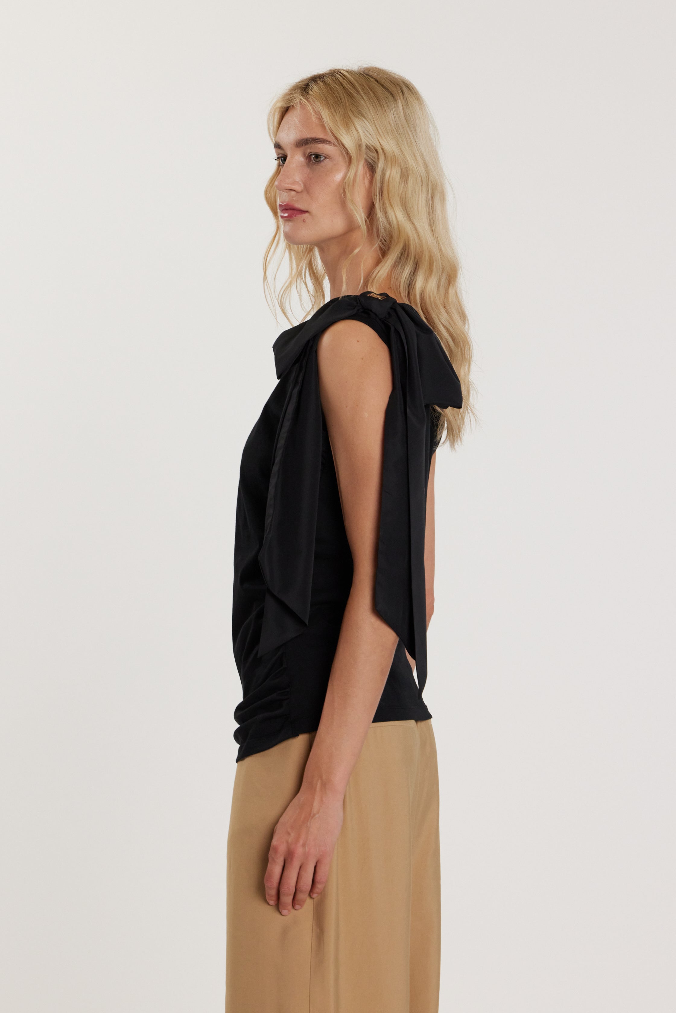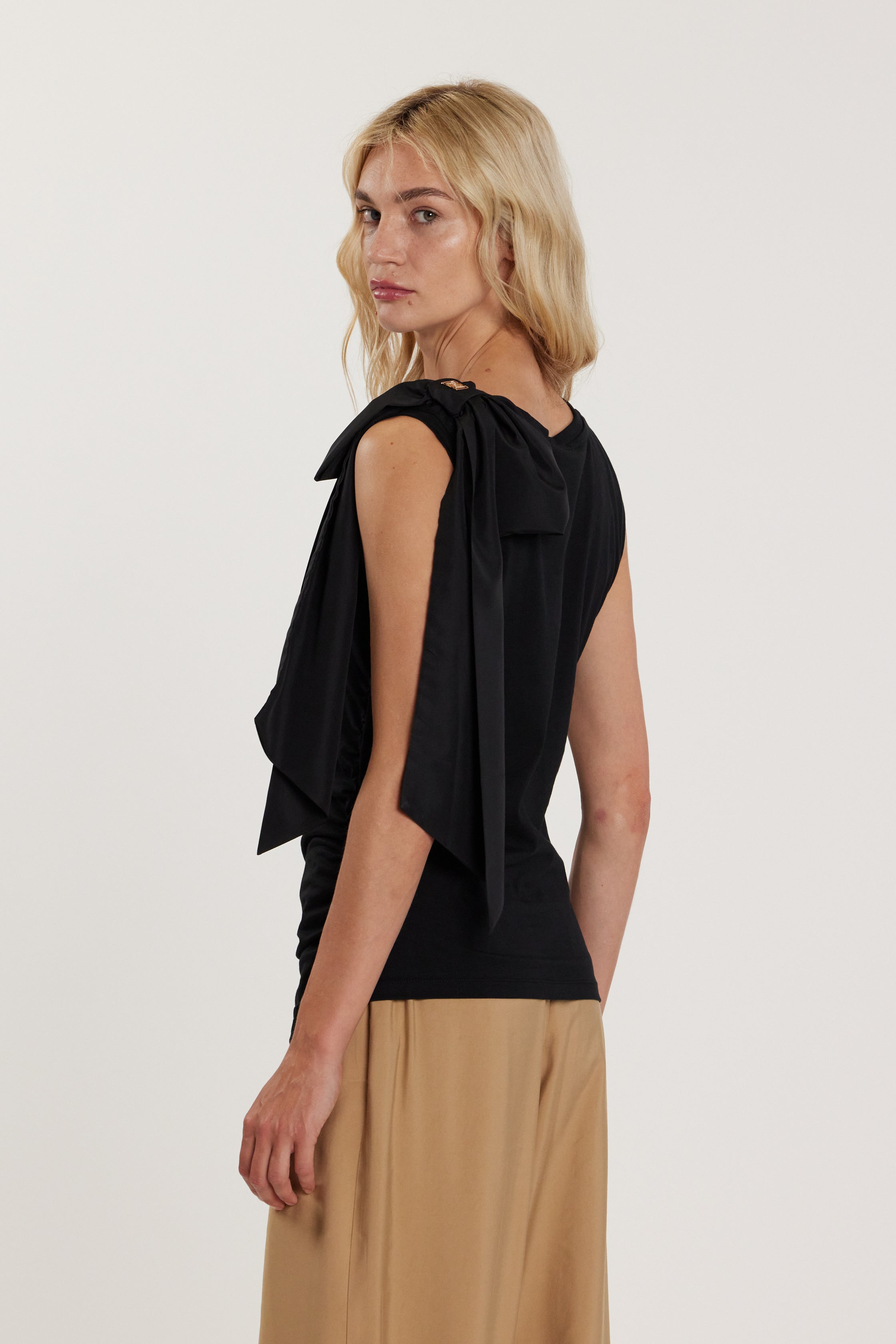 T-Shirt Aimee senza maniche con fiocco sulla spalla e arricci sul fondo, un capo romantico e sofisticato. Il fiocco valorizza delicatamente la spalla, mentre l’arriccio crea movimento e leggerezza. Ideale per outfit eleganti da giorno o cocktail, conferisce charme couture e femminilità discreta.