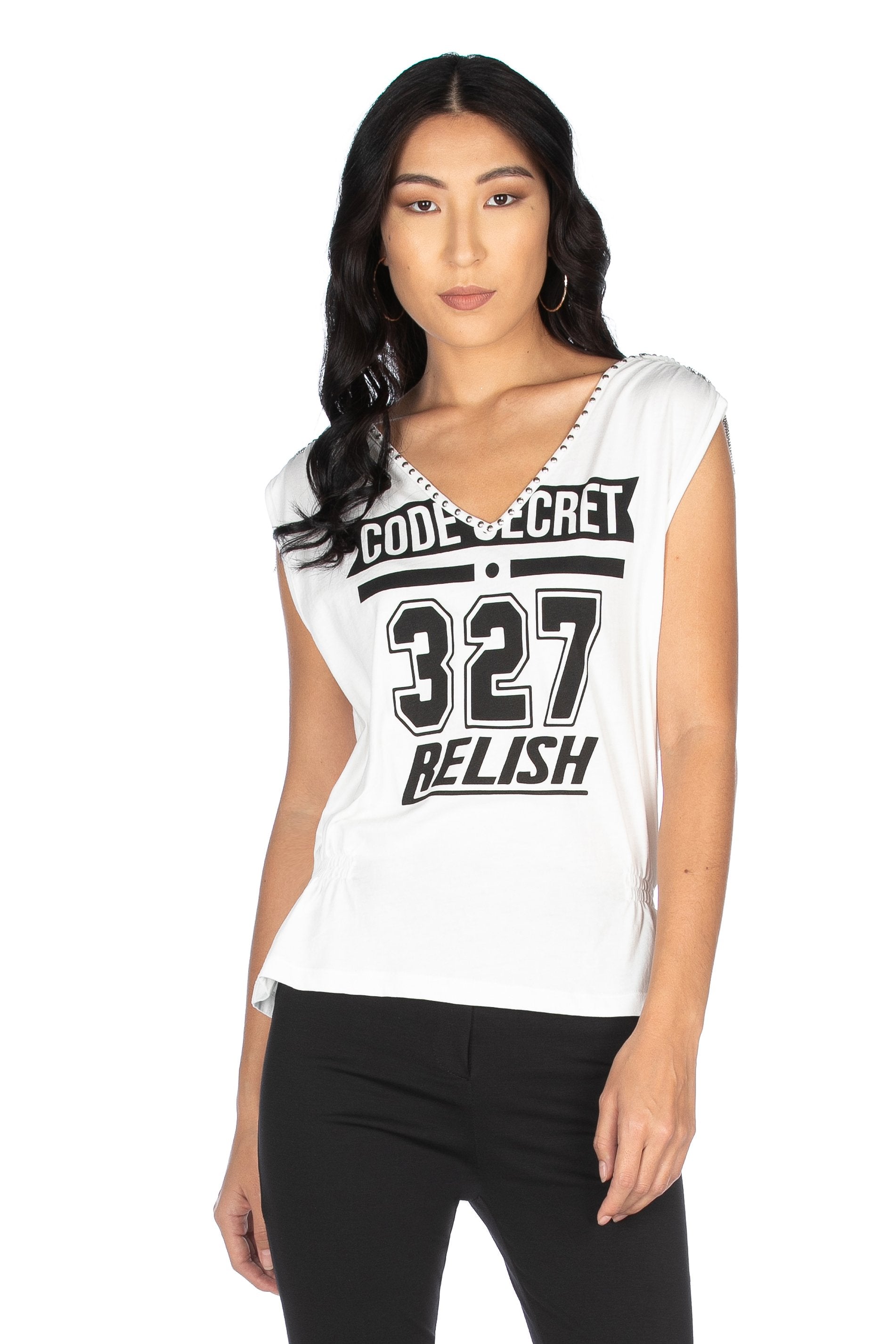 Canotta ZORIGHEZ scollo a v con borchie più patch perline con strass con stampa più arricci