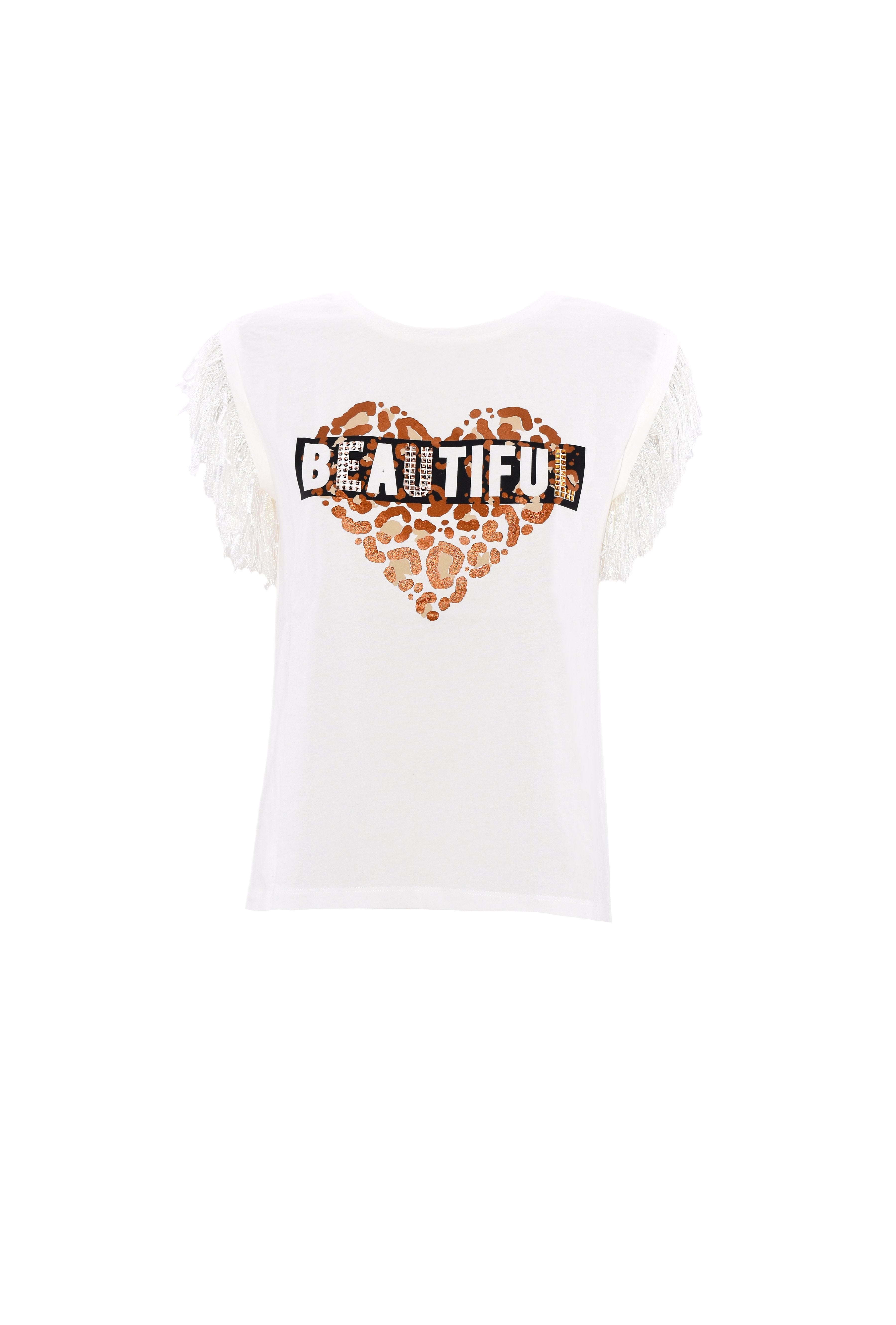 Cuore pulsante e selvaggio in glitter fa da sfondo alla scritta Beautiful nella t-shirt BEGO per esaltare la bellezza di ogni donna che si propone sicura e trendy grazie anche alle maniche ornate di frange.