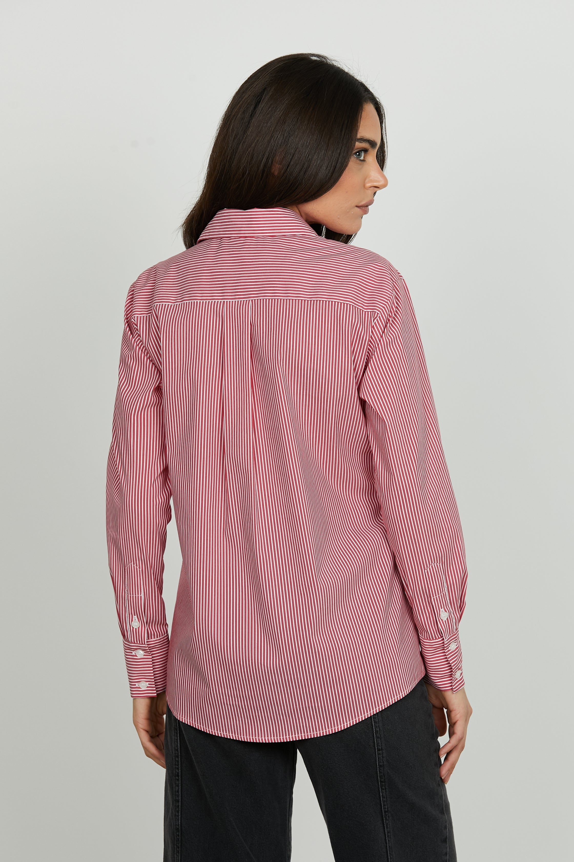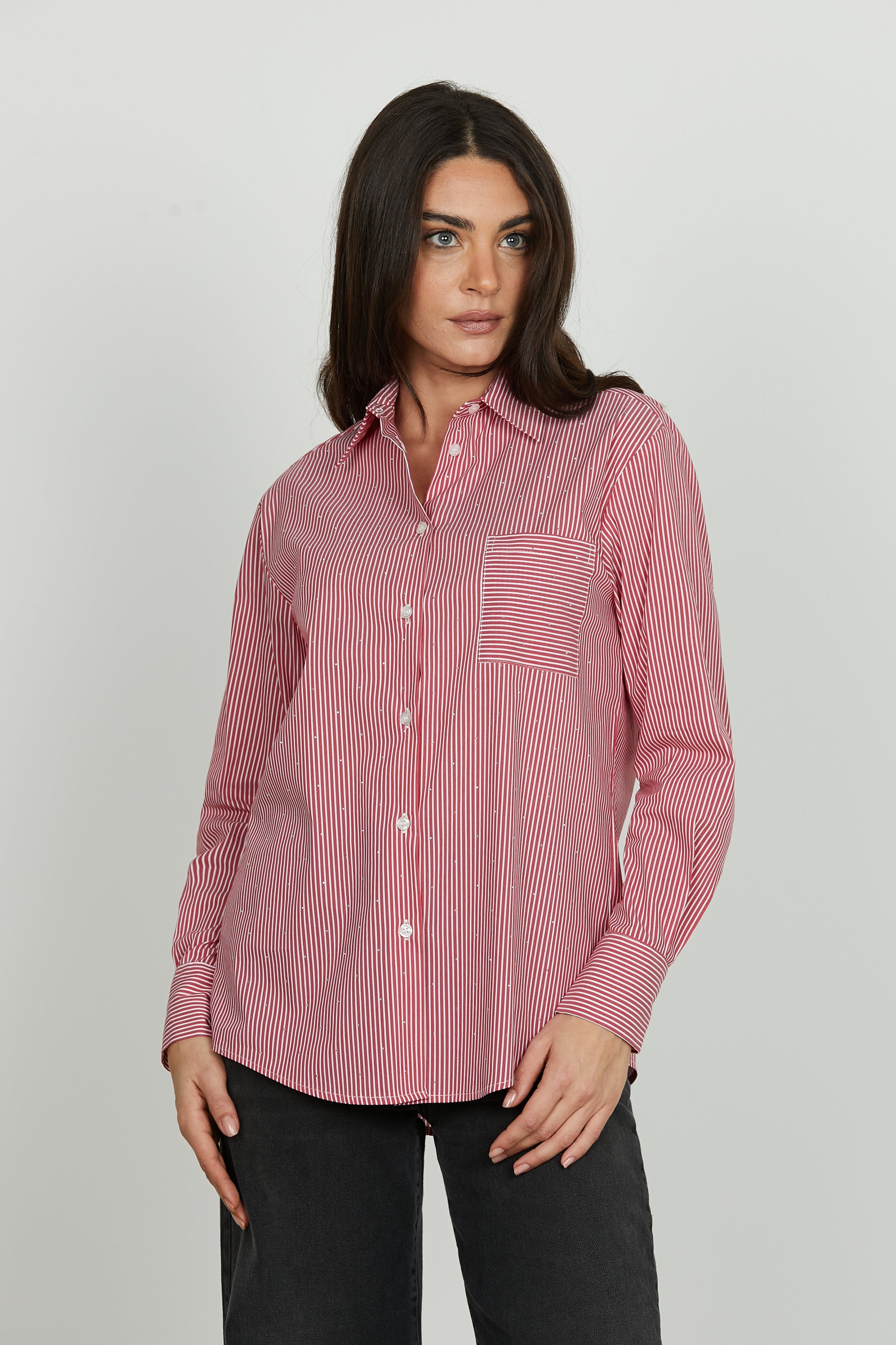 La camicia ASTERIAS reinterpreta un grande classico con dettagli luminosi: la fantasia a righe incontra la luce degli strass applicati, mentre la tasca frontale aggiunge un tocco casual e funzionale. Ideale per look da ufficio rivisitati o outfit casual-chic.